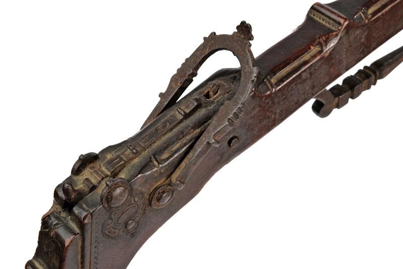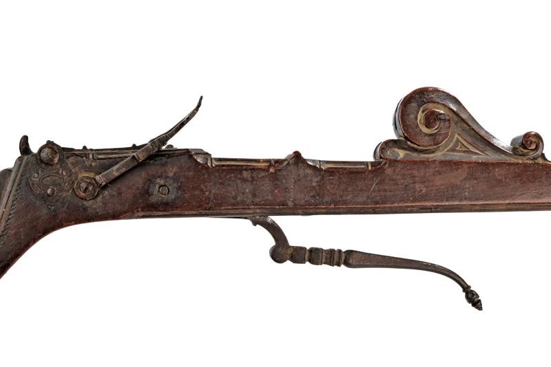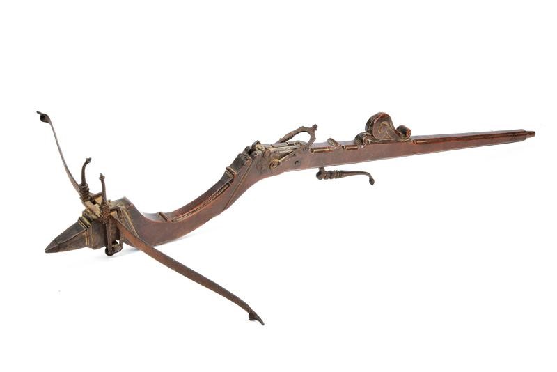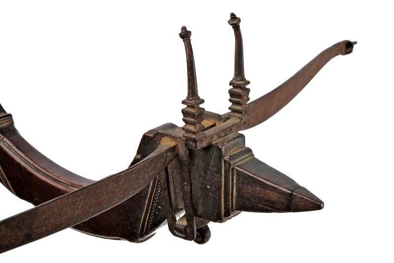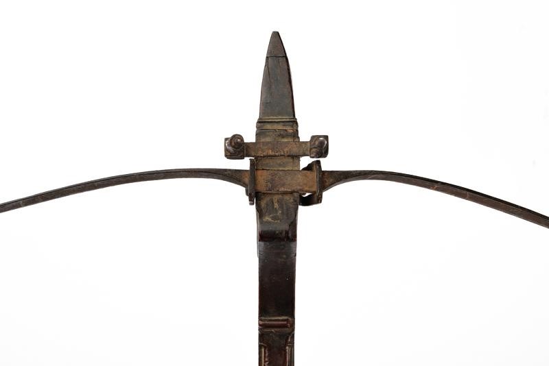 Teniere in legno di sezione quadra; la prima parte incurvata, sul dorso un elemento scolpito simile a un'onda, l'estremità di forma troncoconica appuntita; arco e fornimenti in ferro, parzialmente intagliato.