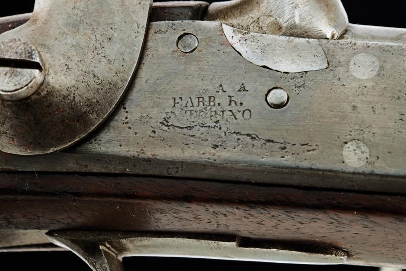 Canna tonda liscia con base quadra recante la data "1848" e due punzoni, cal.17 mm, batteria a molla avanti ridotta a luminello con pochi resti della marcatura "FABB.A. R.A. IN TORINO". Cassa in legno con fornimenti in ferro con punzoni ed anello di sospensione.