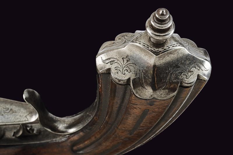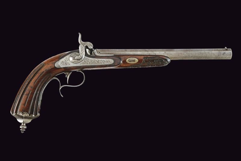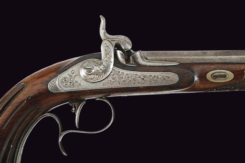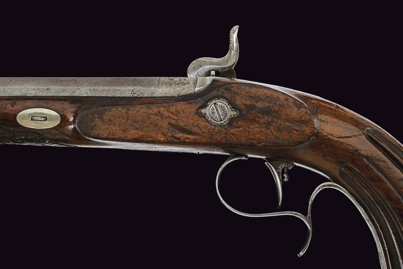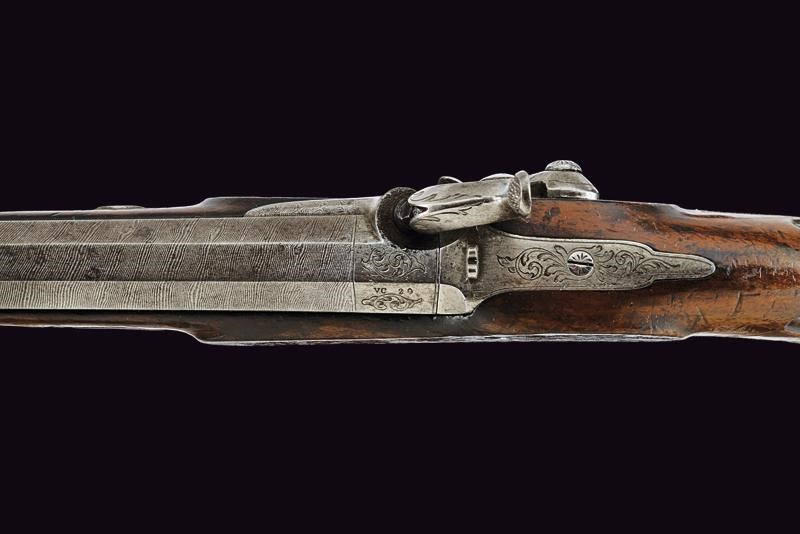 Canna ottagonale, rigata (anima pulita, rigatura ancora visibile), damascata, incisa alla base a motivi floreali e con mirino di precisione, punzone del banco di prova di Liegi su un lato, cal. 12 mm; codetta incisa. Batteria a molla in avanti incisa a motivi floreali, cassa a tre quarti in legno, scolpita a motivi floreali al muso e con calcio scanalato. Fornimenti in ferro decorati en suite, ponticello con poggiadito, stecher. Da cassetta, quindi nata senza alloggiamento per la bacchetta. Il cane non tiene il secondo arresto.