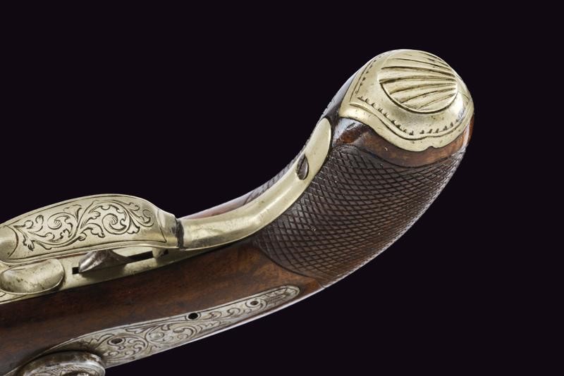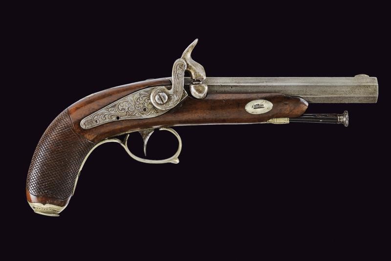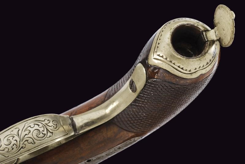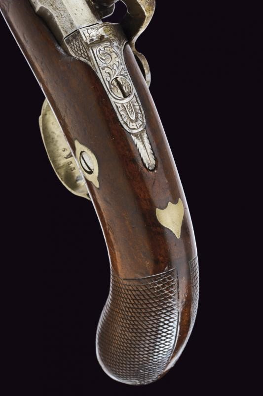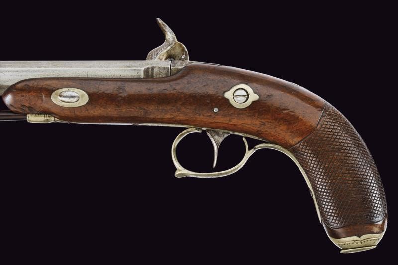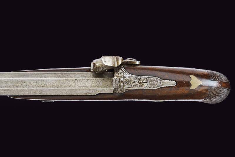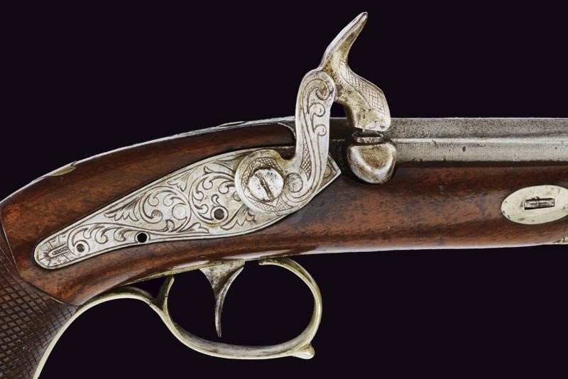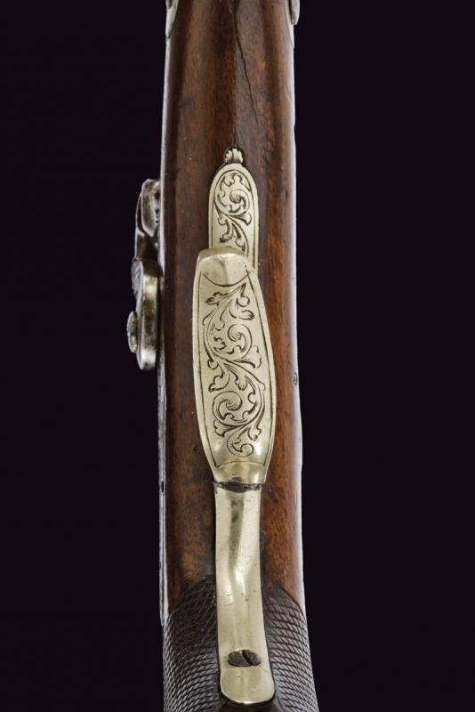 Canna liscia ottagonale dotata di mirino, cal. 8 mm. Codolo inciso e dotato di alzo fisso. Batteria a molla indietro incisa a racemi come anche il collo del cane. Meccanica funzionante (molla fiacca, il cane con leggero gioco). Cassa a tre quarti in legno con impugnatura zigrinata. Fornimenti in metallo bianco. Ponticello inciso a racemi. Coccia con porta capsule. Bacchetta in legno con battipalla in ferro.