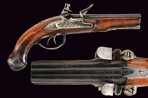 Canne tonde lisce, giustapposte, brunite (la finitura rinfrescata), con resti di incisioni e doratura, cal. 10.5 mm. Codetta delineata ai bordi e con traguardo. Batterie a pietra focaia firmate "Lepage" e con doppie linee sui bordi. Cassa intera in legno leggermente scolpito, con fornimenti in ferro annerito. Bacchetta in ferro. Meccanismo funzionante.