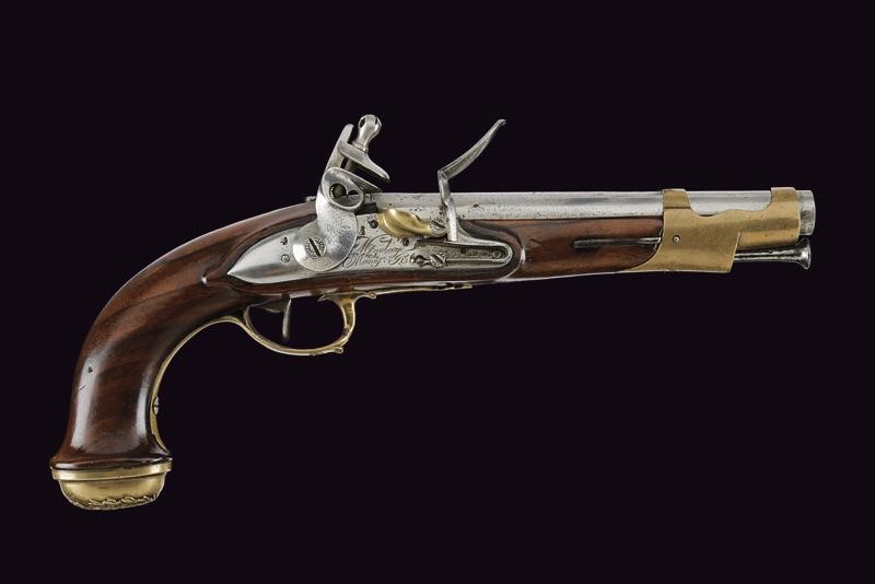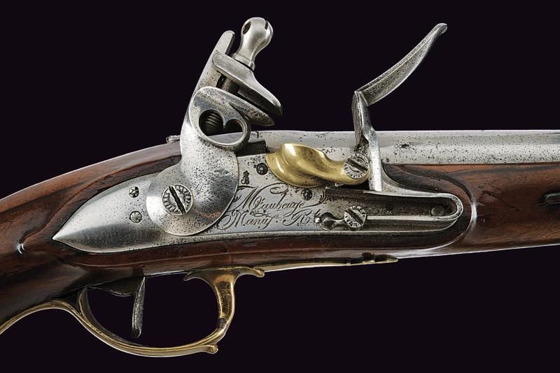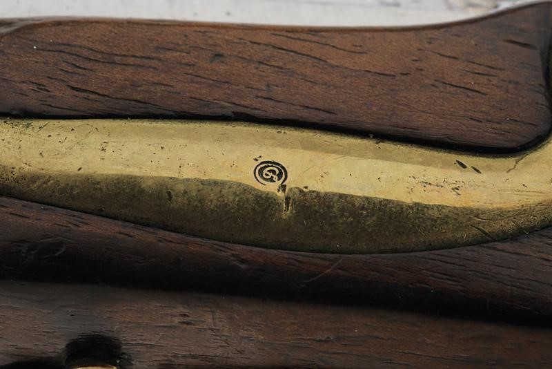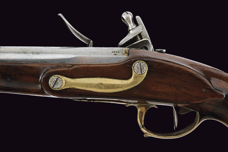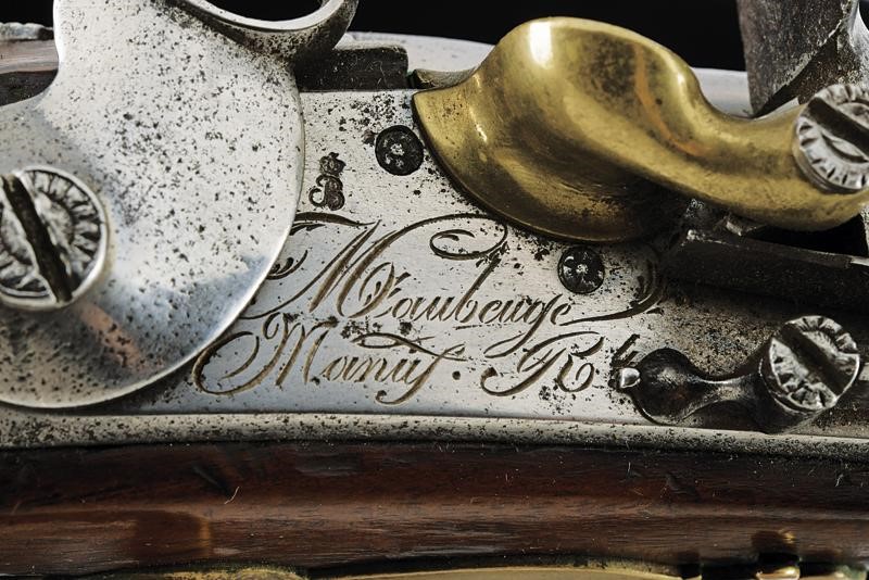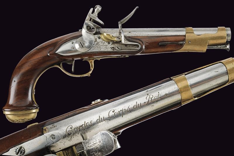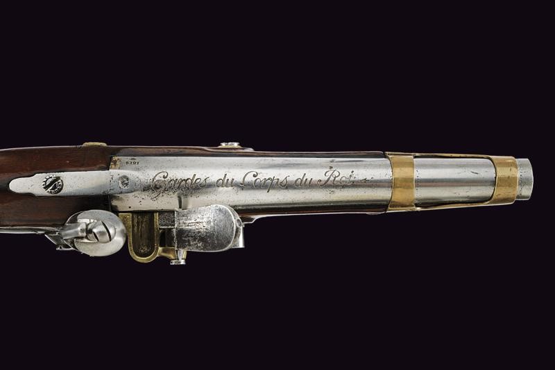 Canna liscia tonda con culatta quadra recante il punzone "B", l'anno "1814" e con un altro marchio, al dorso la marcatura "Garde du Corps du Roi", resti di doratura, cal. 17.5 mm. Batteria firmata "Maubeuge Manuf. R.le"e con punzone "JB" sotto corona, scodellino in ottone. Cassa intera in legno con fornimenti in ottone, la coccia decorata con tre gigli coronati entro fronde di quercia e di lauro. La parte anteriore del ponticello con giglio. Viti con intagli decorativi. Bacchetta in ferro. Molto rara.