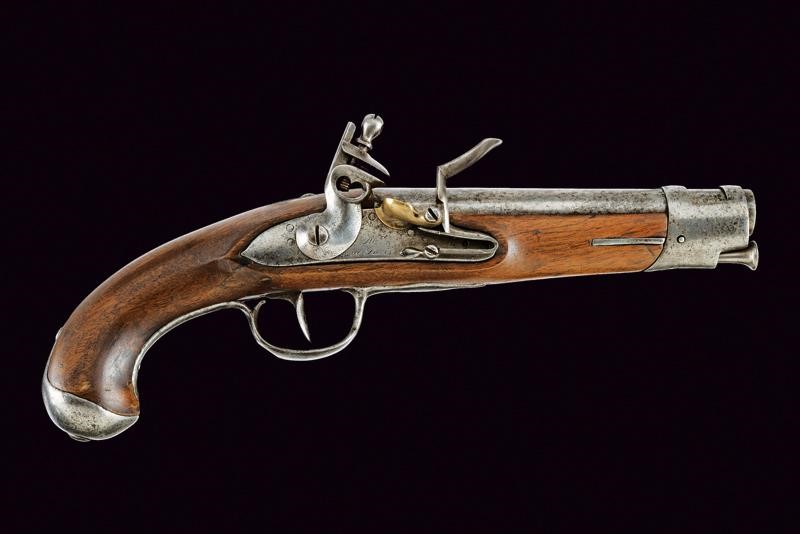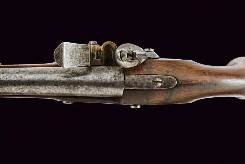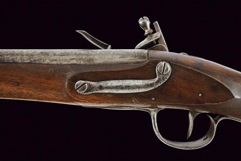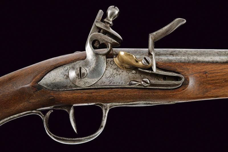 Canna liscia tonda, cal. 18 mm; batteria a pietra focaia marcata "M.re de Paris", scodellino in ottone. Cassa intera in legno con fornimenti e bacchetta in ferro.