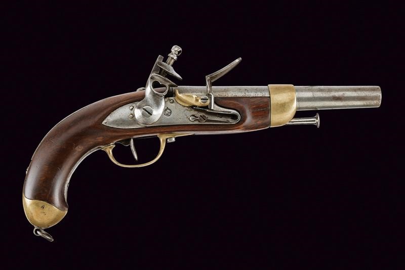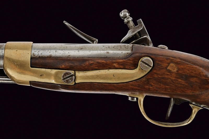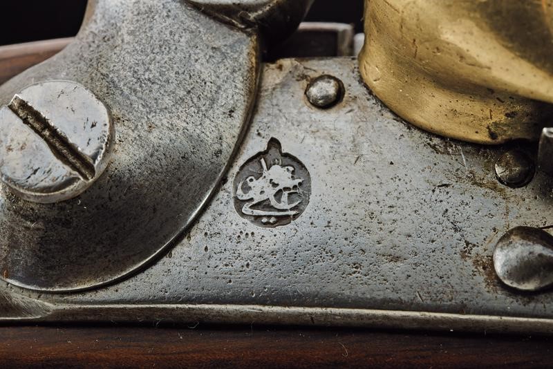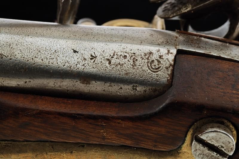 Canna tonda liscia con base quadra recante punzone, cal. 17 mm; codetta liscia. batteria con bella marca tipo Tughra, scodellino in ottone e cane traforato a forma di cuore. Cassa in legno (crepa restaurata) con fornimenti in ottone e ferro, la coccia con lo stesso punzone della canna. Bacchetta in ferro. Probabilmente Turca.