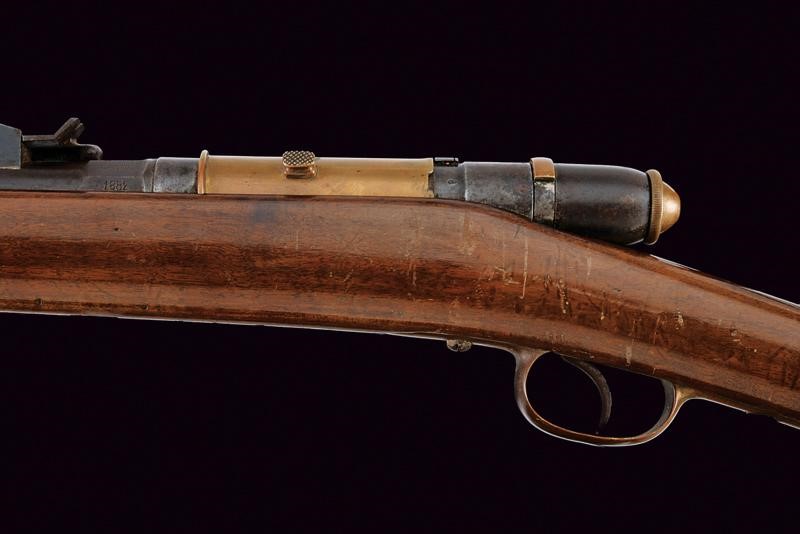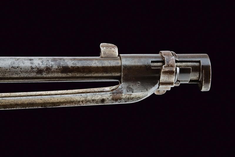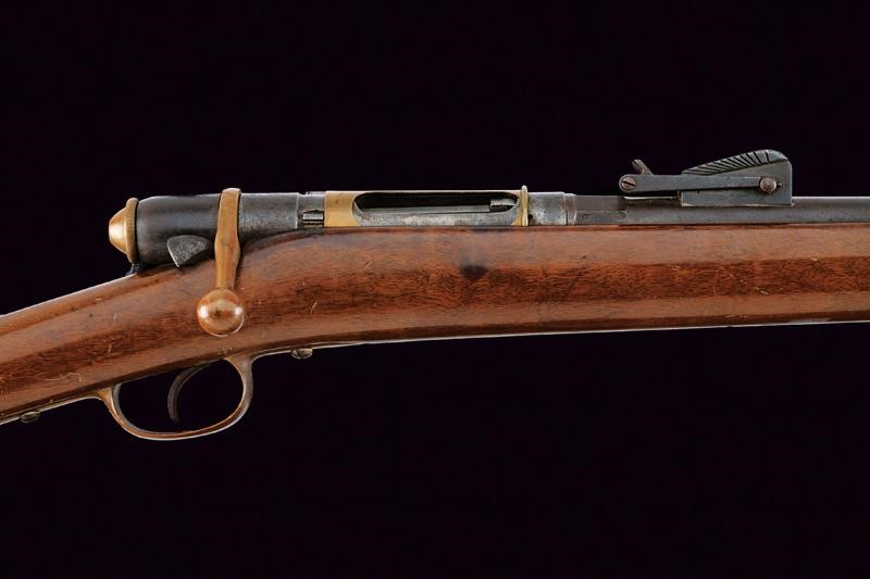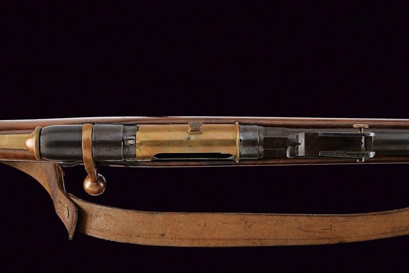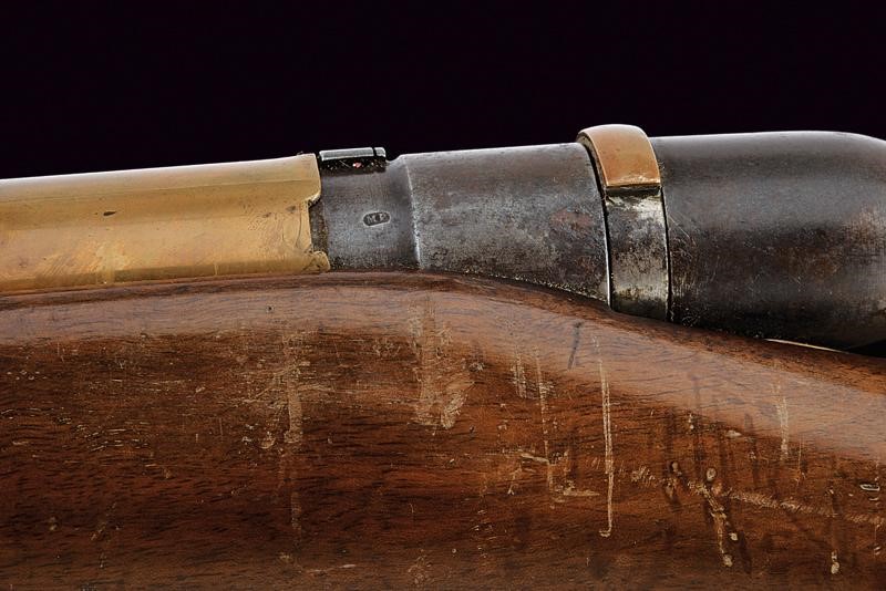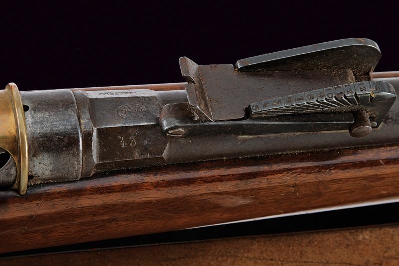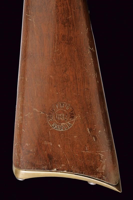 Canna tonda rigata, dotata di mirino e alzo regolabile, punzonata alla base "43", con marchio "RG", timbro con scudo sabaudo coronato, "P.P.", "BRESCIA" e con data "1882"; piccole zone con danni da ruggine, cal. 10,35 mm. Otturatore girevole-scorrevole munito di ghiera di copertura rivestita di ottone, come anche la leva di caricamento. L'otturatore marcato "MP". Mezza cassa in legno, il lato destro della pala recante il timbro "ARTIG.A. FAB.A D'ARMI BRESCIA 1882". Ponticello, calciolo e bocchino interamente in ottone, il codolo superiore con collo in acciaio rivestito d'ottone. Completo della sua baionetta a ghiera, punzonata "CT" e con matricola "43" coeva. Cinghia in cuoio.