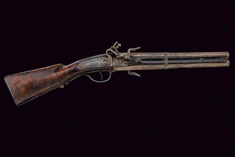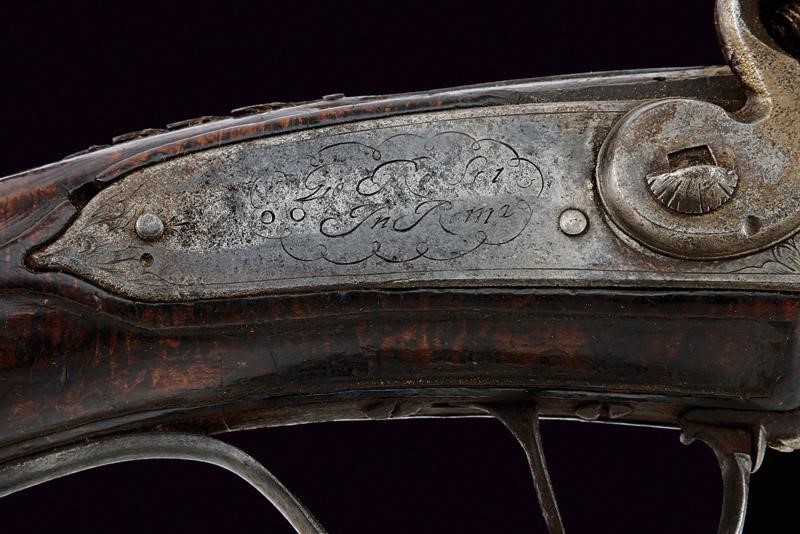 Canne girevoli, lisce, a due ordini, prima ottagonali poi tonde, cal. 17 mm. Batteria a molla indietro con firma "Gio Rossi in Roma", incisa a motivi floreali come anche le piastre delle martelline; cassa in tre parti di legno con bordo rilevato, il calcio pieghevole dotato di bottone d'apertura, la parte tra le canne sgusciata al centro. Fornimenti in ferro, il ponticello con molla per la rotazione delle canne. Gancio da cintura in ferro. In patina, difetti, piccole mancanze e danni da ruggine (superficiale). Bacchetta in legno con battipalla in ferro.