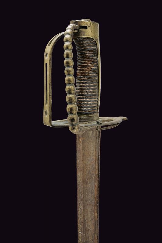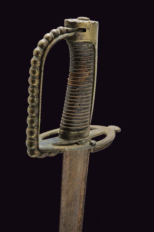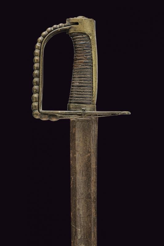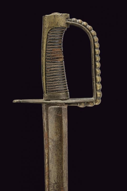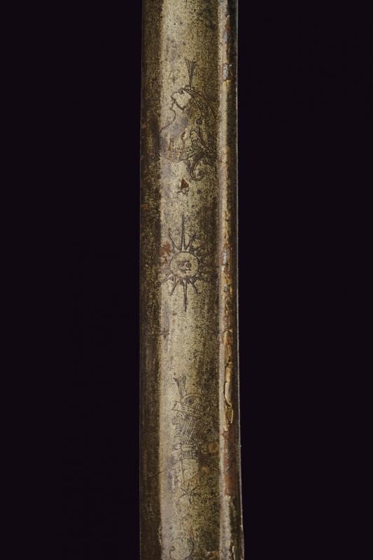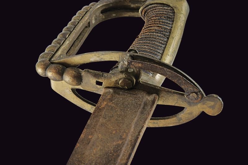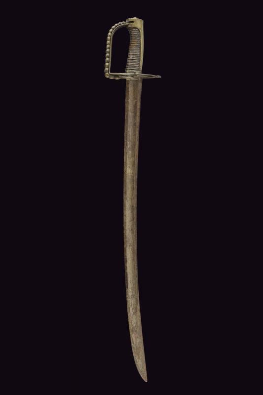 Larga lama leggermente curva a un filo e controfilo con ampio sguscio centrale e sottile scanalatura dorsale, incisa al forte con teste di Pandur, sole, luna e stelle. Fornimento in ottone con valva traforata, ramo dell'elso piatto e traforato, inoltre un ramo aggiuntivo tornante, con decorazione perlinata. Cappetta liscia e lunga. Impugnatura in legno rivestita di cuoio (piccole mancanze) con trecciola metallica. Rara.