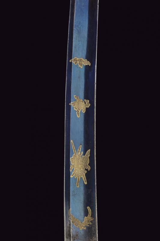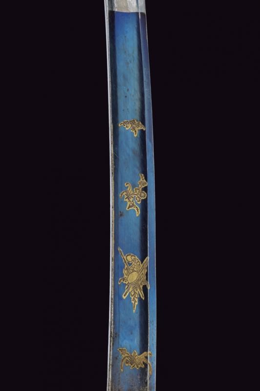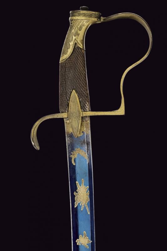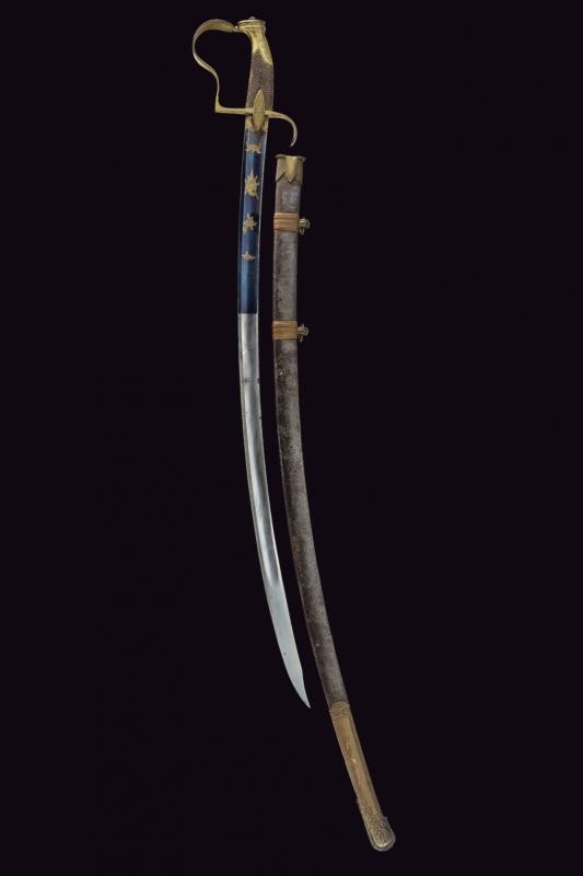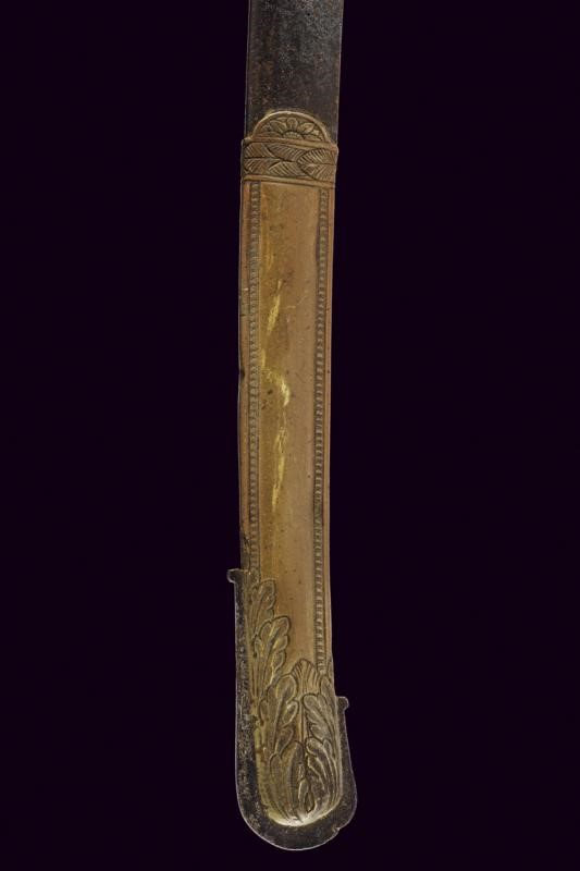 Lama curva a un filo, punta e breve controfilo, sgusciata per buona parte della lunghezza. Recante al forte piccole incisioni a fiorami e trofei con resti di doratura, su fondo brunito color blu. La base dorata con resti di marcatura. Fornimento in ottone con guardia a staffa. Il braccio di parata palmato, le alette fermafodero con incisione a fiore. Impugnatura in legno con zigrinatura (crepe). Cappetta corta incisa a foglie. Fodero in ferro a due campanelle, i fornimenti in ottone, privi di doratura. D'epoca rivoluzionaria.