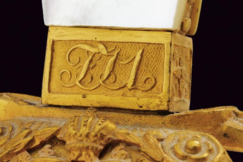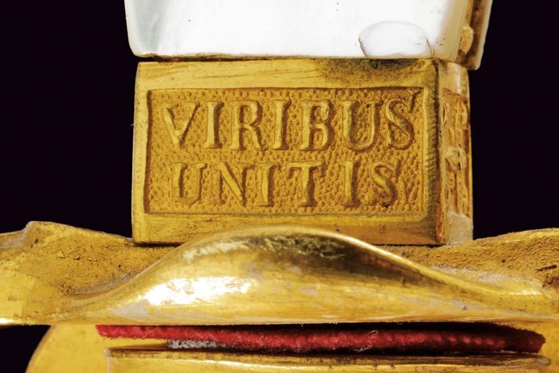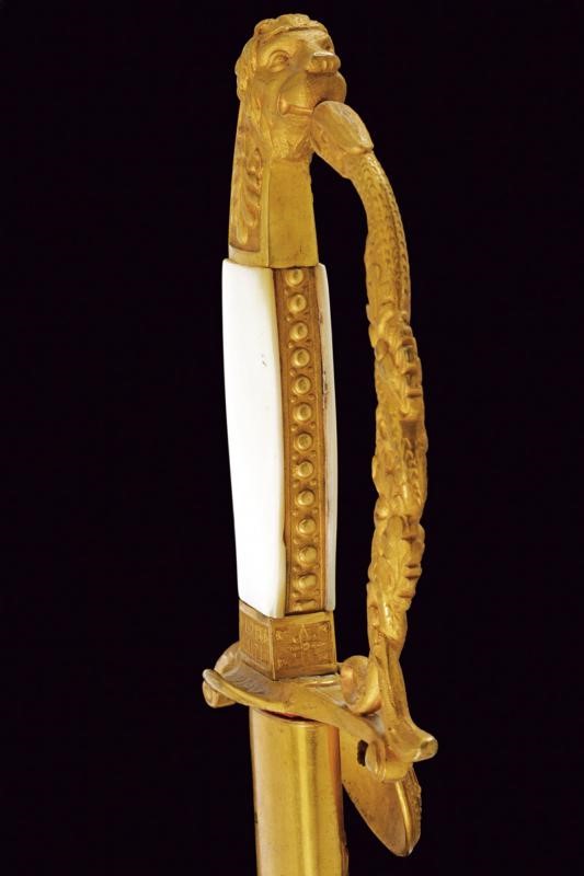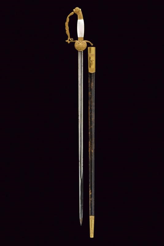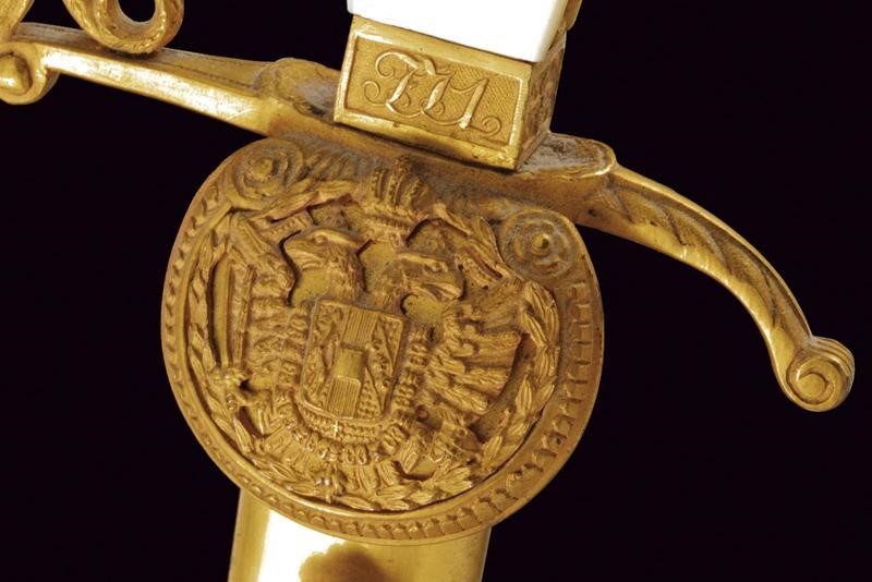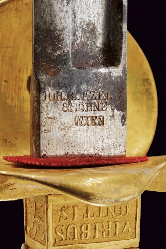 Lama a un filo, punta e breve controfilo, sgusciata per buona parte della lunghezza. Qualche segno d'uso e del tempo. Tallone marcato "JOH. BLAZINC & SOHN WIEN". Fornimento in ottone dorato. Pelta con emblema imperiale in rilievo, guardia a serpente con fronde di quercia, pomo a testa di leone. Guancette lisce in madreperla, ghiera con monogramma reale su un lato e "VIRIBUS UNITIS" sull'altro lato. Fodero in cuoio antico con fornimenti in ottone dorato ed inciso a motivi floreali.
