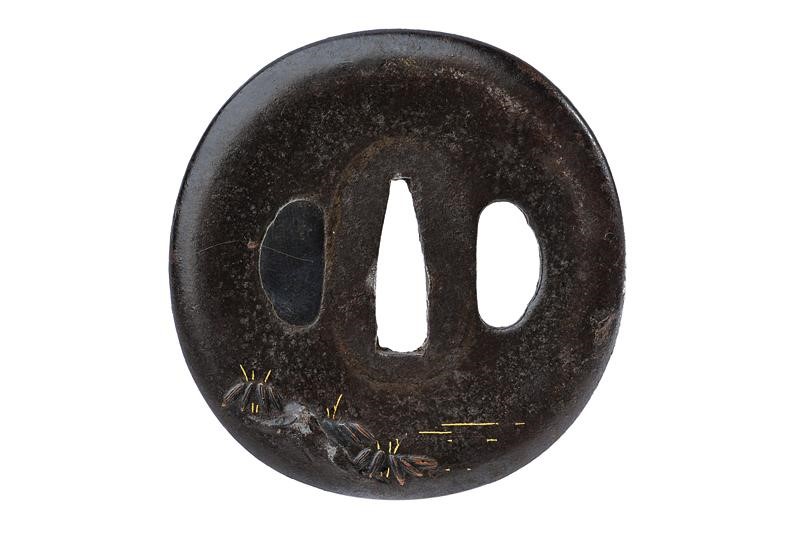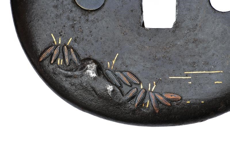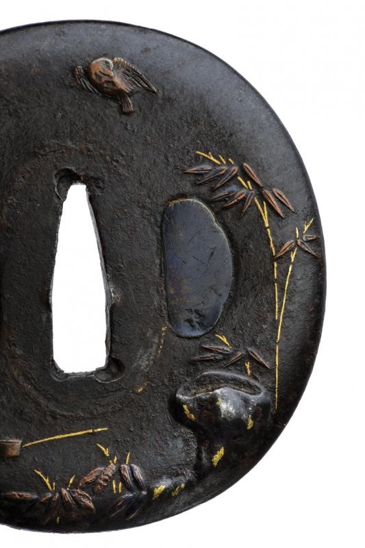 In ferro tate-maru-gata, niku-bori, ore-taga-zogan in oro e rame. Raffigurante un uccello e piante. Kozuka e kogai hitsu-ana, il kogai hitsu-ana con ategane. XVIII secolo. In kiri-box.
