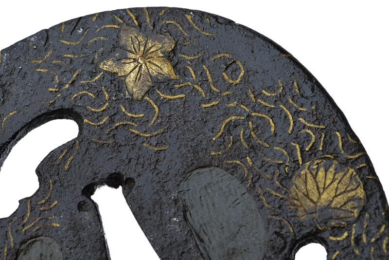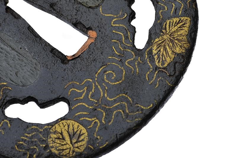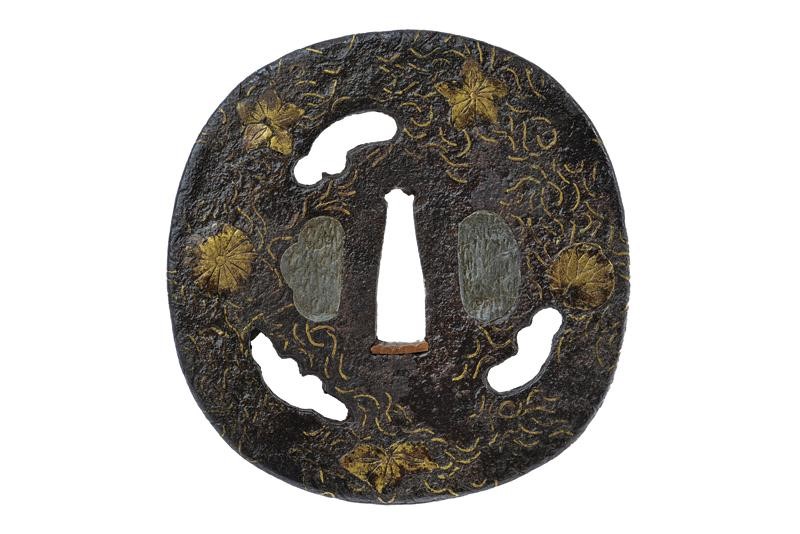 In ferro tate-maru-gata. hira-zogan, con bordo che si assottiglia a partire da metà del piano verso l'esterno. Il disegno è formato da vari fiori e agemine in filigrana rimesse in ottone (mancanze). Kozuka e kogai hitsu-ana con ategane. Nakago-ana con resti di sekigane. XVIII secolo. In kiri-box.