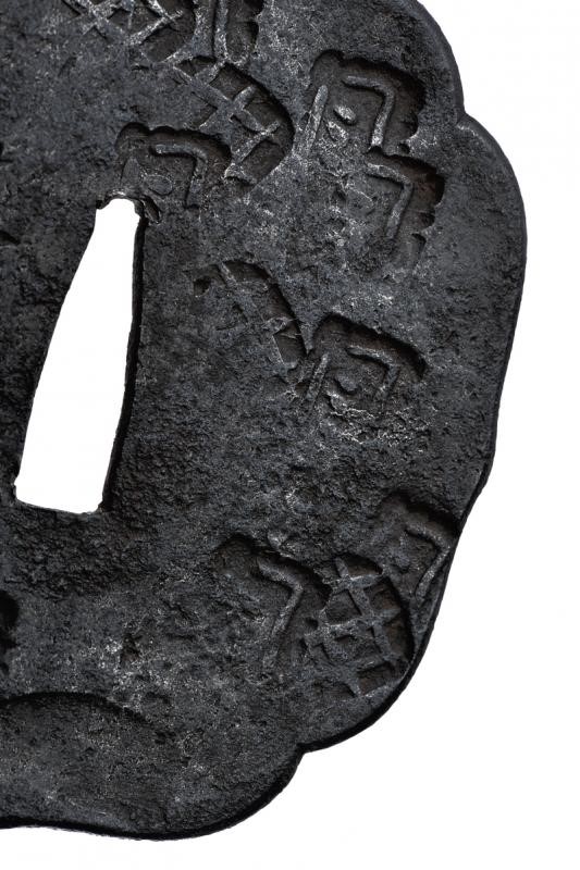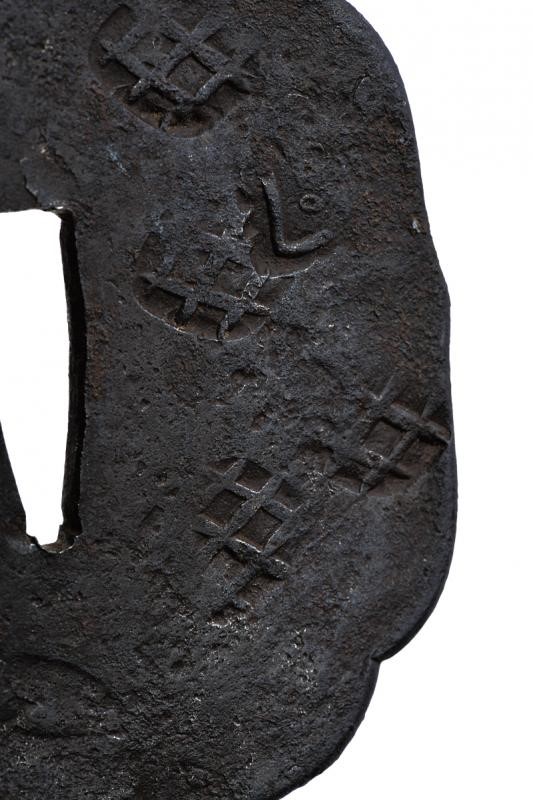 In ferro, mokko-gata, con superficie tsuchime lavorata con kanji e stampe. XVIII secolo. In kiri-box.