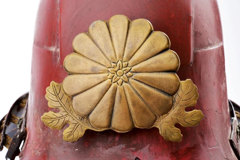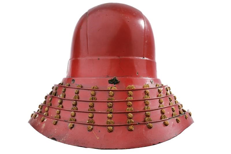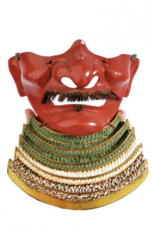 L'elmo con hachi in ferro a tre piastre laccato rosso (qualche mancanza e restauro alla finitura), munito di shikoro a cinque lame in ferro allacciate sugake odoshi in tessuto antico fortemente sbiadito, anche le piastre del shikoro laccate rosse, con segni del tempo e lievi mancanze alla finitura. L'interno del coppo in patina bruna, senza fodera. Munito di un maedate (più tardo?) in ottone lavorato a crisantemo. Insieme con un men joroi, leggermente meglio conservato dell'elmo, del tipo, me no shita men, ressei in ferro laccato rosso pallido (lievi mancanze alla finitura) con naso rimovibile munito di antichi mustacchi, rughe espressive non particolarmente accennate, bocca senza denti, mento con pizzo, odome e asenagashi no hana. Lacca interna sempre in rosso conservata come l'esterno. Yodare-kake a cinque lame in lacca dorata con allacciatura multicolore. Supporto non incluso.