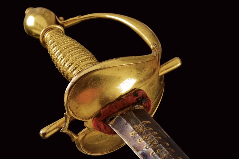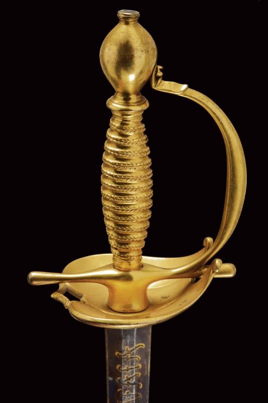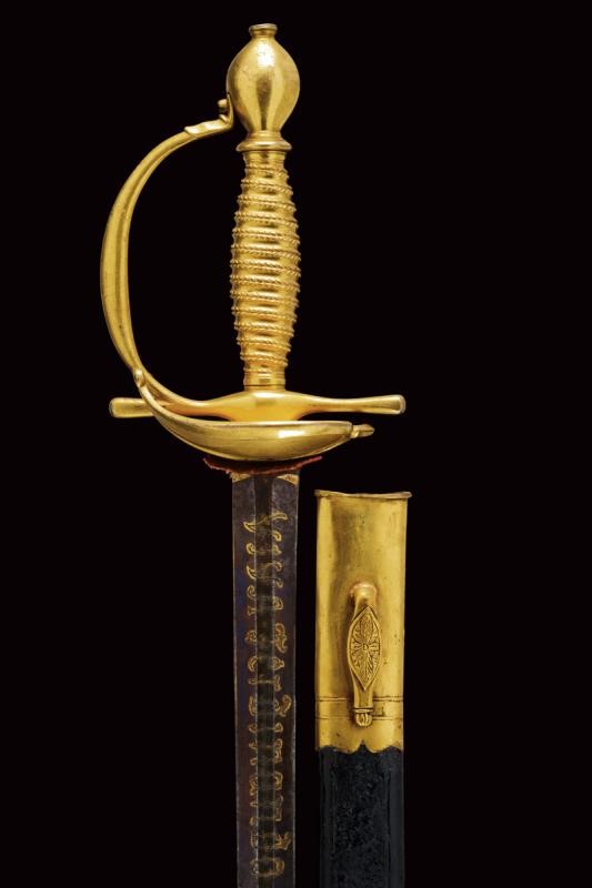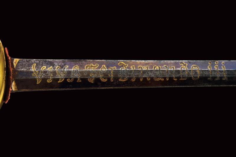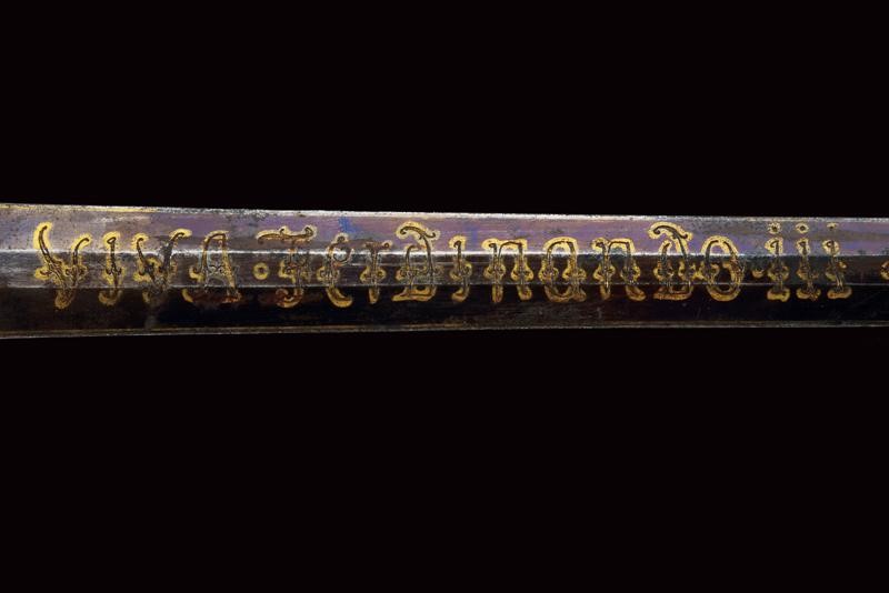 Lama dritta a due fili di sezione esagonale; la base incisa e dorata su fondo blu, recante l'iscrizione "VIVA FERDINANDO III" su entrambi i lati. Fornimento in ottone massiccio, dorato e munito di valva a cuore, pomo ovale a urna ed impugnatura con finta trecciola. Fodero in cuoio (danni e segni d'uso) con fornimenti in ottone dorato ed inciso. Rara.