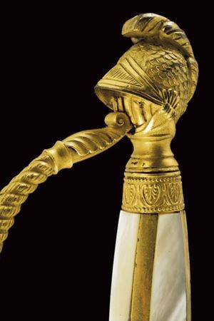 Lama di sezione triangolare a facce incavate; la prima parte incisa e dorata su fondo blu a trofei e motivi floreali, la base marcata "K&S". Fornimento in ottone dorato. Pelta finemente decorata, recante il giglio borbonico al centro cinto dal collare di San Gennaro, sormontato da corona e caricato su un'àncora, incorniciato da fronde di quercia e su fondo finemente granulato. Il ramo di guardia finemente intagliato a effigiare una sagola lavorata a spire, il pomo con elmo all'antica. Impugnatura con quattro lastre in madreperla e doghe in ottone dorato. Fodero in cuoio con fornimenti in ottone dorato ed inciso. La doratura sul retro della cappa in parte svanita per via dell'uso. Molto raro.