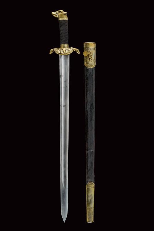 Lama dritta a un filo, punta e breve controfilo, sgusciata. Fornimento in ottone con pelta recante trofeo di caccia in rilievo, elso a bracci terminanti a testa di segugio. Impugnatura in ebano zigrinato, pomo a testa di cinghiale. Fodero in cuoio antico con fornimenti in ottone sul tipo delle spade militari napoletane. Per guardiacaccia?