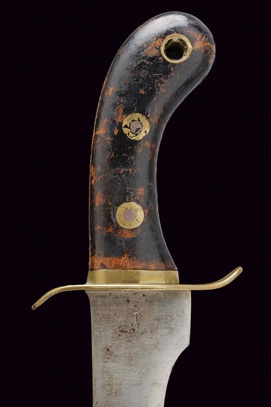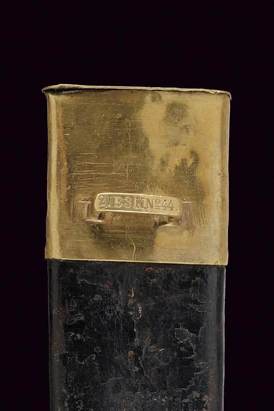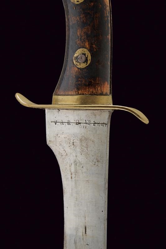 Blade with anchor-shaped mark and barred marking "V.A.R.B. No 122". Slightly counter-curved, flat, brass quillon. Wooden grips. Antique leather scabbard (partially unstitched) with brass mounts, the loop on the cap marked "21B3KN44".