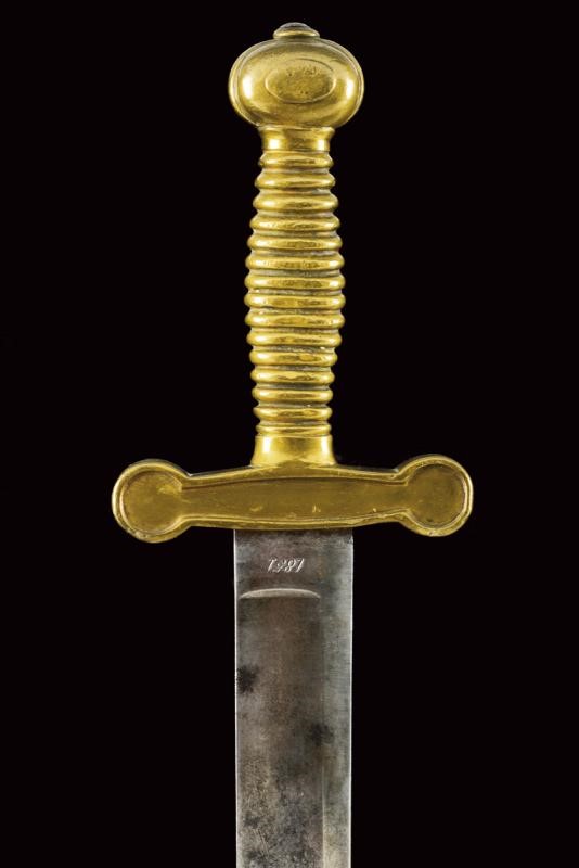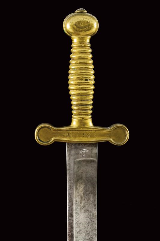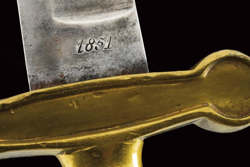 Larga lama a un filo e controfilo con ampio sguscio, il tallone marcato "SRF", con punzone "Z" e anno "1851"; fornimento in ottone massiccio marcato "4/C 13". Completa di fodero in cuoio con fornimenti in ottone e taschetta in cuoio bianco.