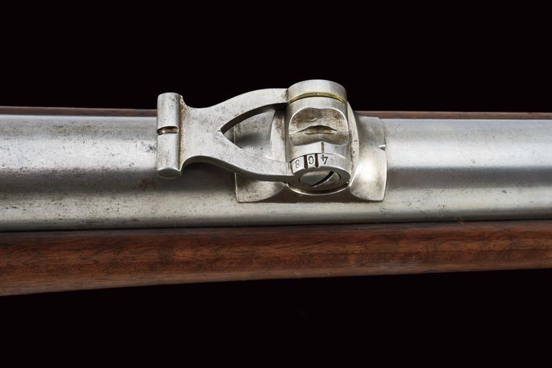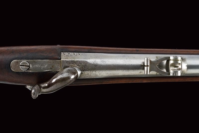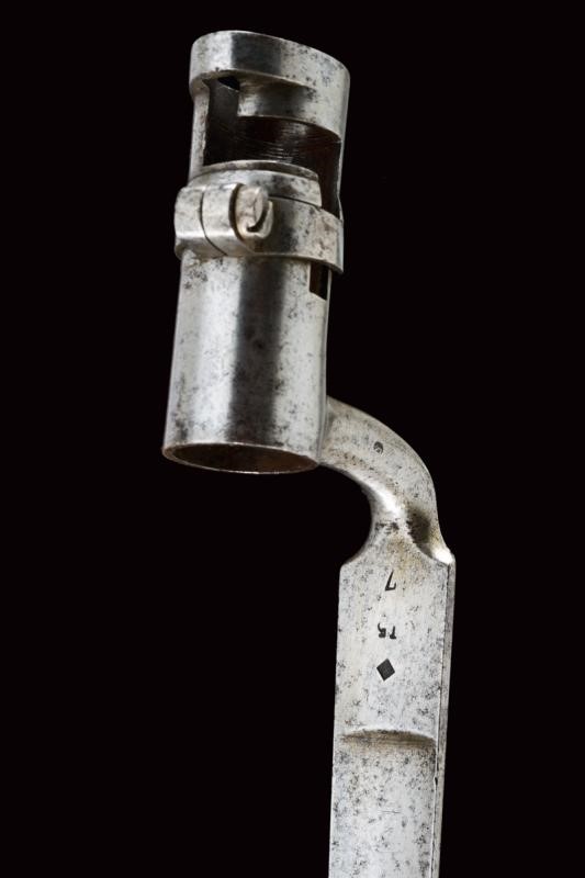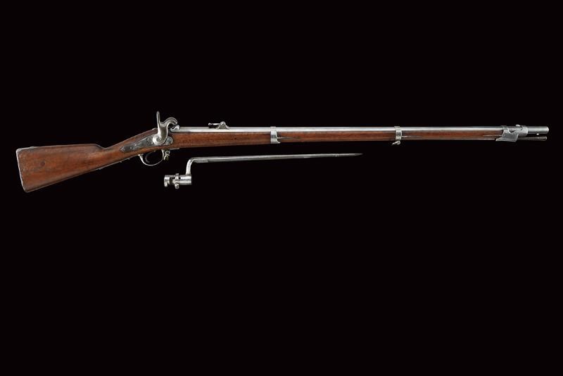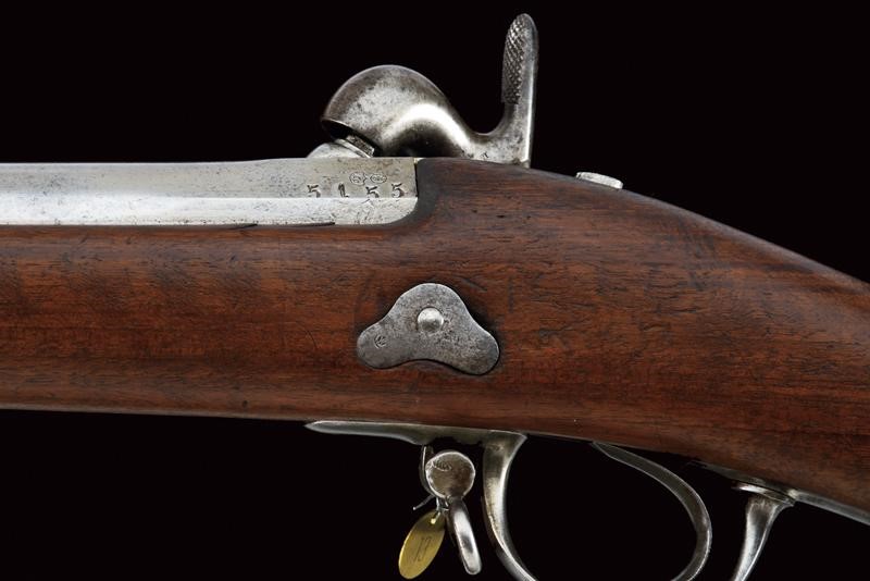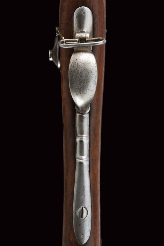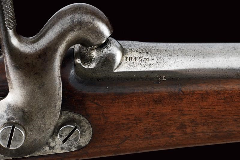 Canna tonda rigata, con culatta ottagonale recante i punzoni "MR", numeri di serie, "AC" coronato dentro una pelta, e "T" coronato, con la data "1845". Al dorso un alzo del tipo svizzero e il mirino, cal. 18 mm. Dente d'innesto per baionetta. L'anima con incrostazioni da pulire, la rigatura visibile. Codolo con marcatura del modello. Qualche intaccatura attorno al pistone. Batteria a molla in dietro marcata "M.re R.le de St. Etienne" e con marchio "G" sormontato da stella. Cassa intera con resti di timbro "MR" sulla pala. Fornimenti e bacchetta in ferro. Baionetta a ghiera (lungh. 52,3 cm). Meccanica funzionante.