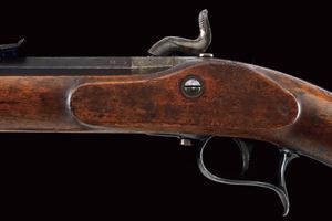 Canna tonda rigata, dotata di mirino, numerata al dorso, con alzo regolabile, dotata di culatta ottagonale marcata con punzoni "BF" coronato, "P", "B" e con due timbri del banco di Liegi. Anima da pulire, rigatura visibile, cal. 10,4 mm in volata. Batteria a molla in avanti punzonata "BF" coronato, e marcata "BEURET FRERES A LIEGE". Meccanica funzionante. Cassa intera in legno con resti di timbri fra i quali "BF" coronato. Fornimenti in ferro con resti di brunitura antica. Bacchetta in ferro. Per Cacciatori Pontifici?