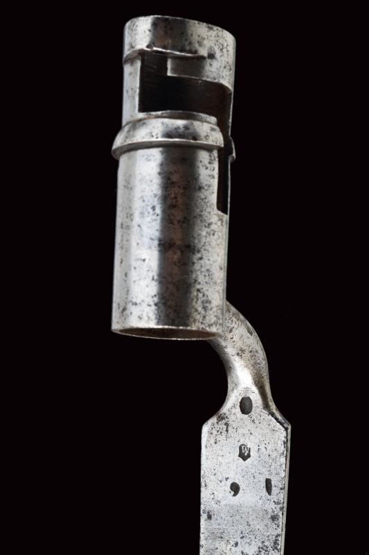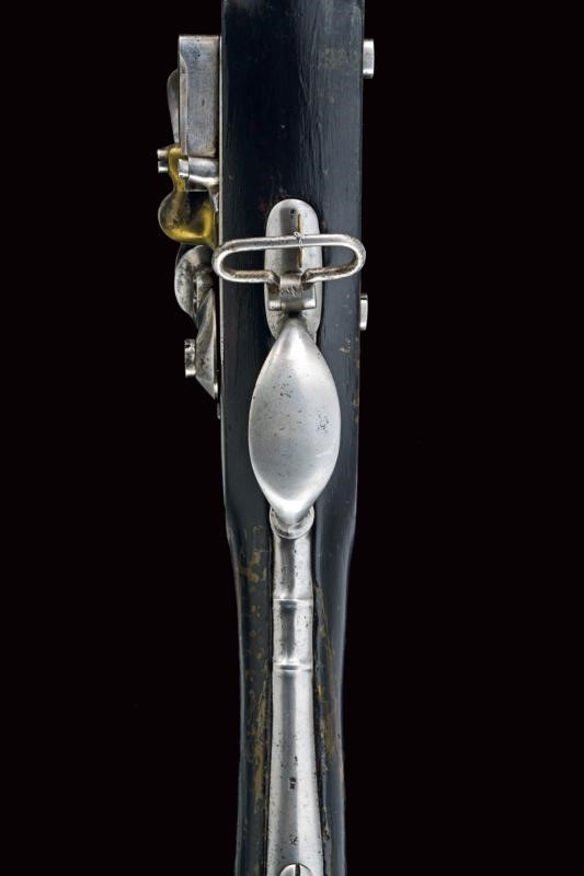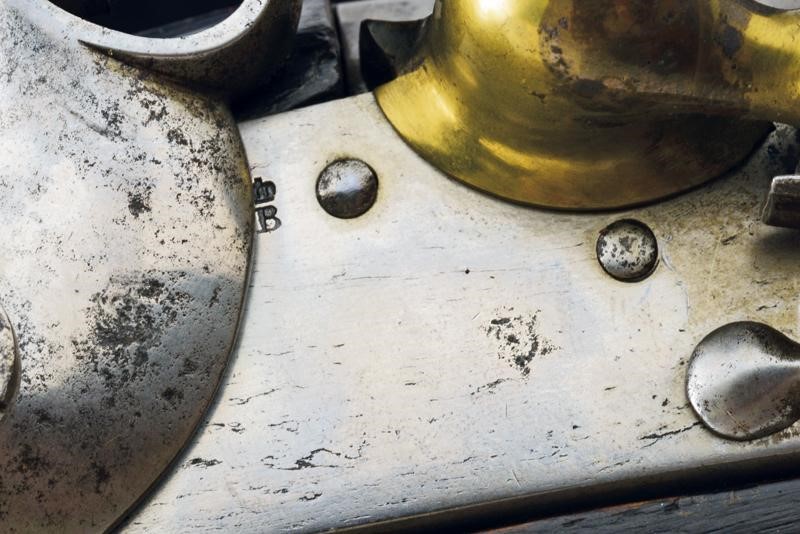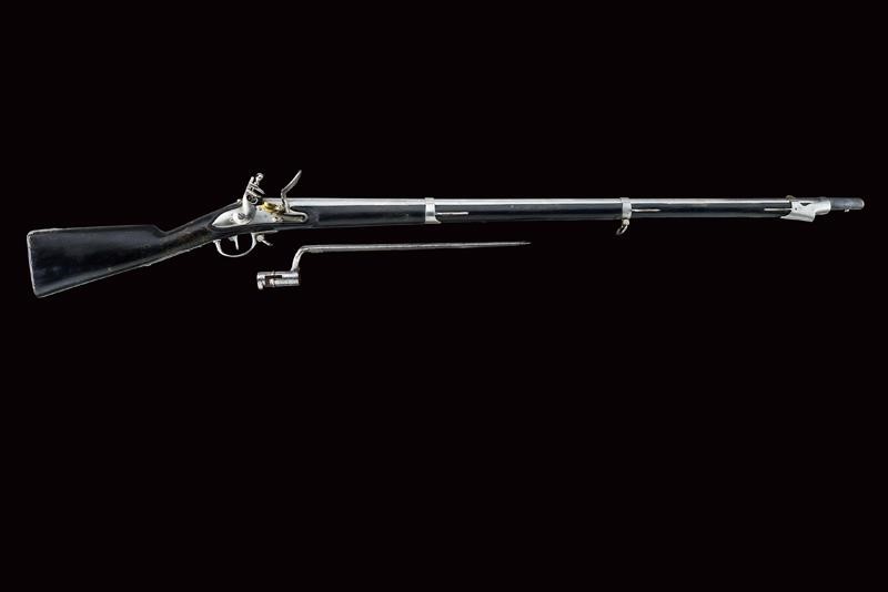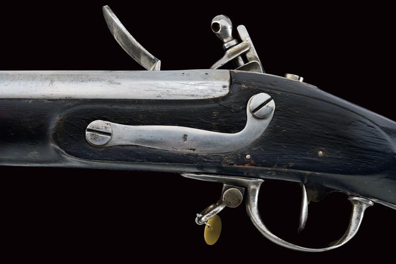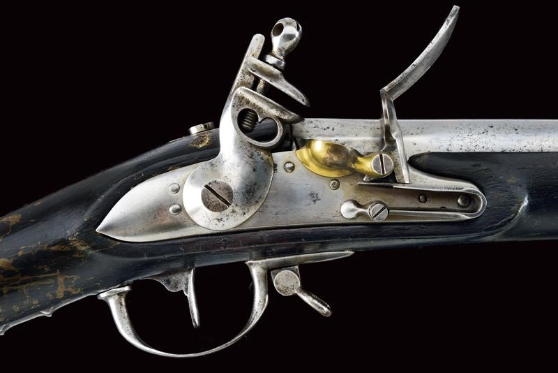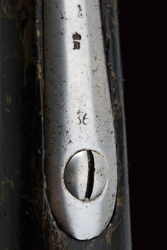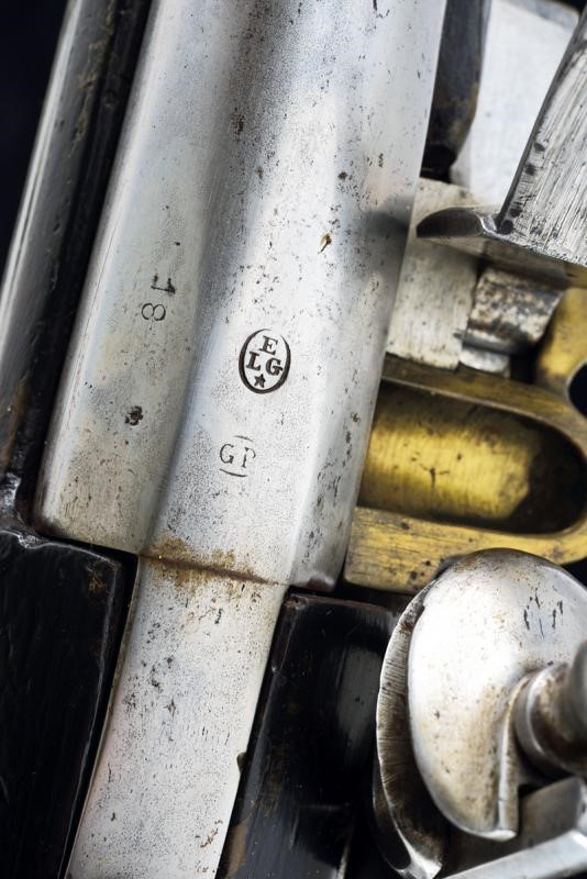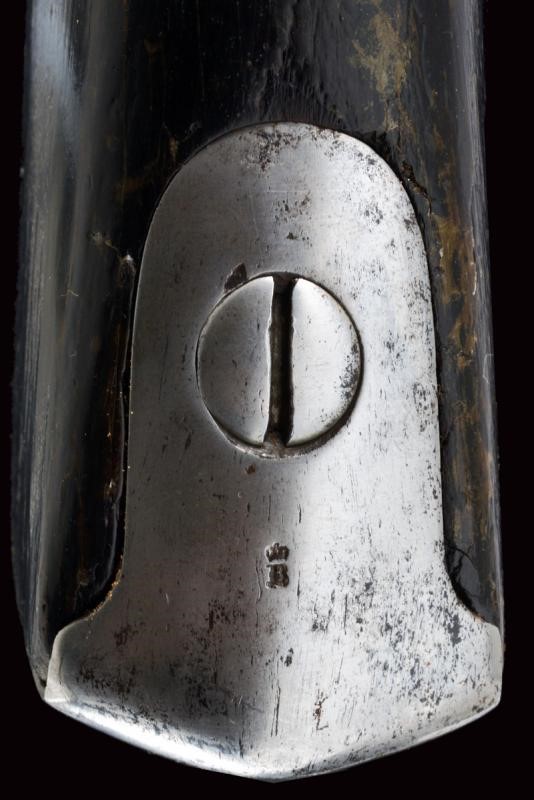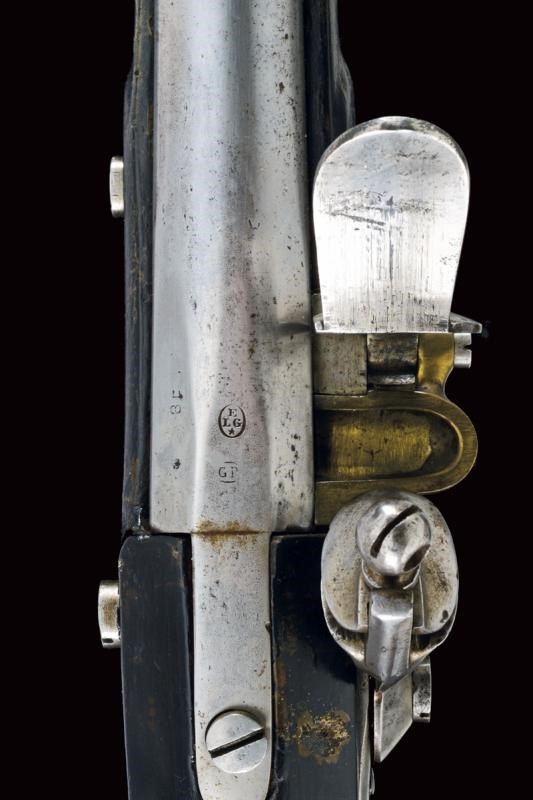 Canna tonda liscia con culatta ottagonale, dotata di dente d'innesto per baionetta, alla base resti di marchio "GP" entro un ellisse, timbro del banco di prova di Liegi e resti di altre marcature. Anima da pulire. In volata cal. 18 mm. Batteria con con cartella timbrata con "B" coronata. Meccanica ben funzionante. Cassa intera in legno (verniciata color nero o bitumata, restauri?) Fornimenti in ferro. Contropiastra, ponticello e calciolo tutti marcati con "B" coronata. Il calciolo stesso anche con vite puntinata. Bacchetta mancante. Baionetta a manicotto (ghiera mancante), lunga 46,5 cm Da appunti del proprietario il fucile sarebbe stato impiegato presso le truppe pontifice.