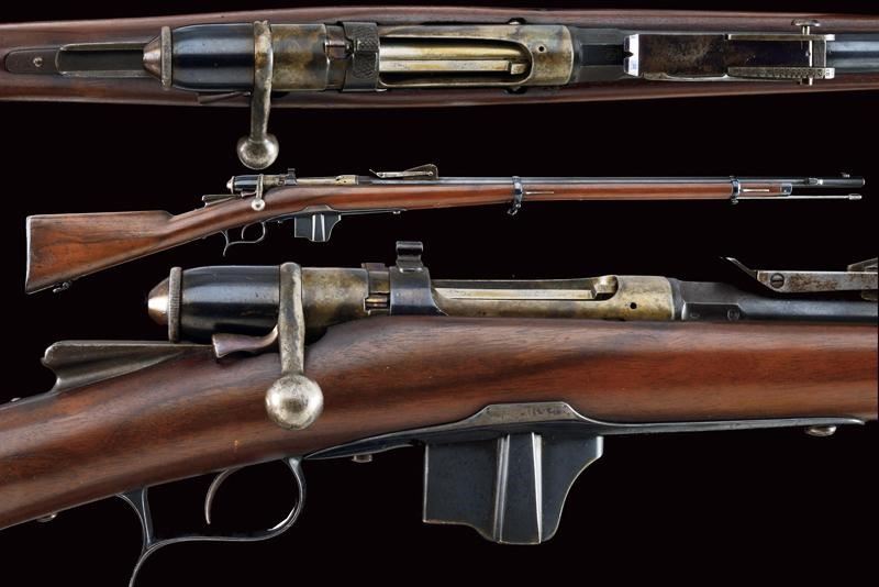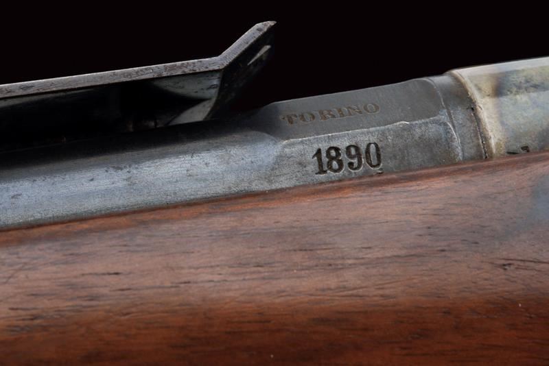 Canna tonda rigata dotata di mirino, alzo regolabile, guida d'innesto per baionetta, la culatta con punzone sabaudo, marcatura "TORINO", anno "1890", e con un'altro punzone, cal. 10 mm. Otturatore girevole-scorrevole funzionante, senza coperchio. Cassa intera in legno. Fornimenti in ferro. Completo di bacchetta.