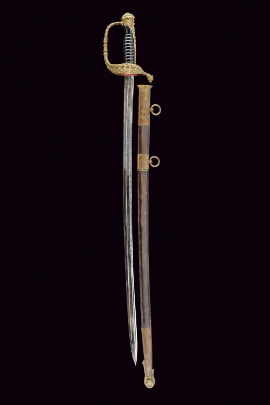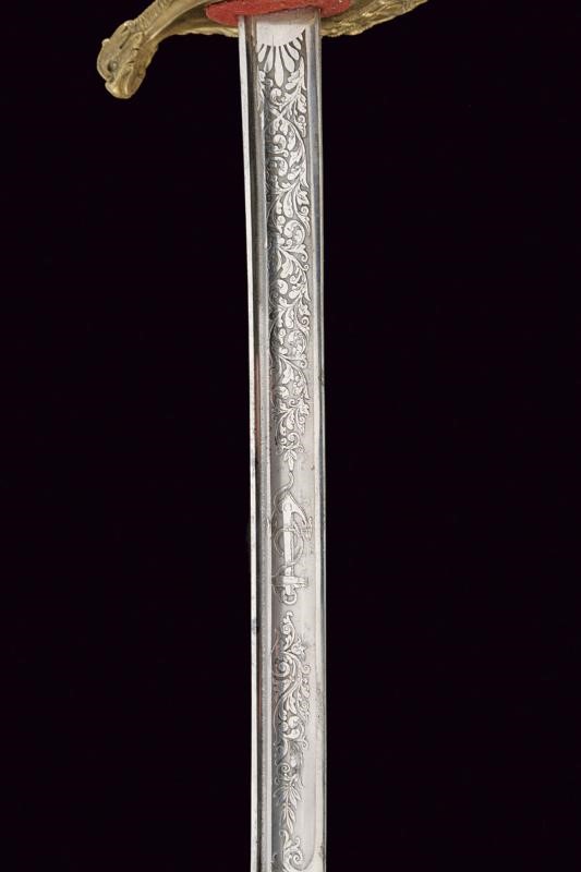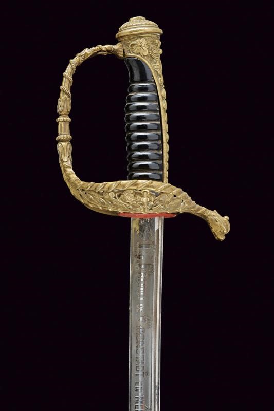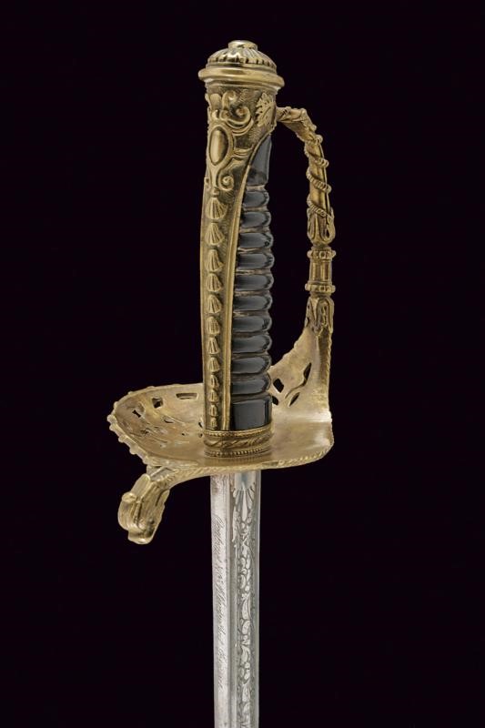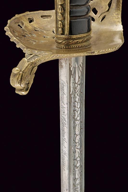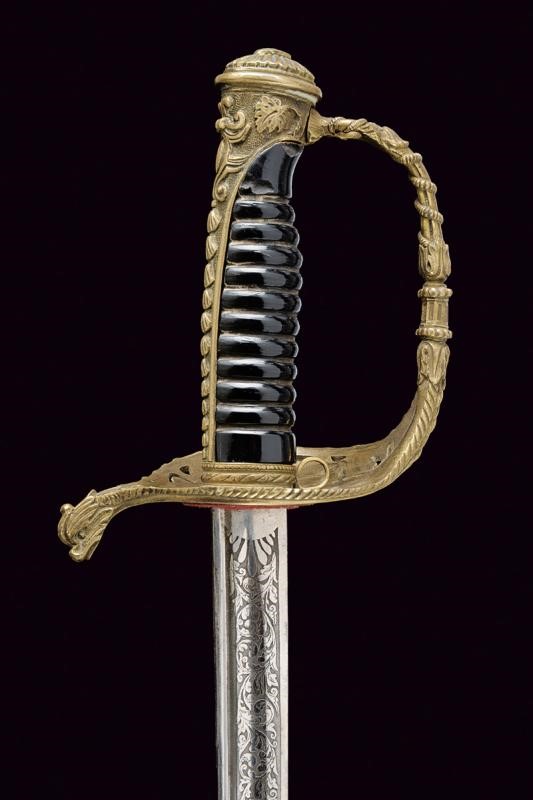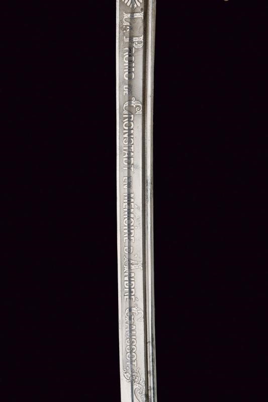 Lama leggermente curva a un filo e controfilo con sguscio centrale e scanalatura vicino al dorso, la prima parte incisa con l'iscrizione "LA PROMO DE CRONSTADT EN MEMORIE D'ANDRE GAUSSOT" su un lato e, sull'altro decorata con l'ancora e disegni floreali. Il dorso marcato "Coulaux & Cie Klingenthal France". Fornimento in ottone riccamente inciso e traforato, la valva con un'ancora tra foglie. Impugnatura in ebano a spire senza trecciola. Completa di fodero in cuoio con fornimenti in ottone, la cappa con àncora. Gancio e due anelli di sospensione. Il puntale decorato con una conchiglia en suite con la decorazione lungo il dorso dell'impugnatura. Rara.