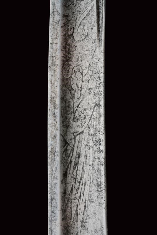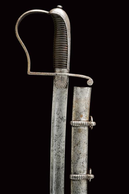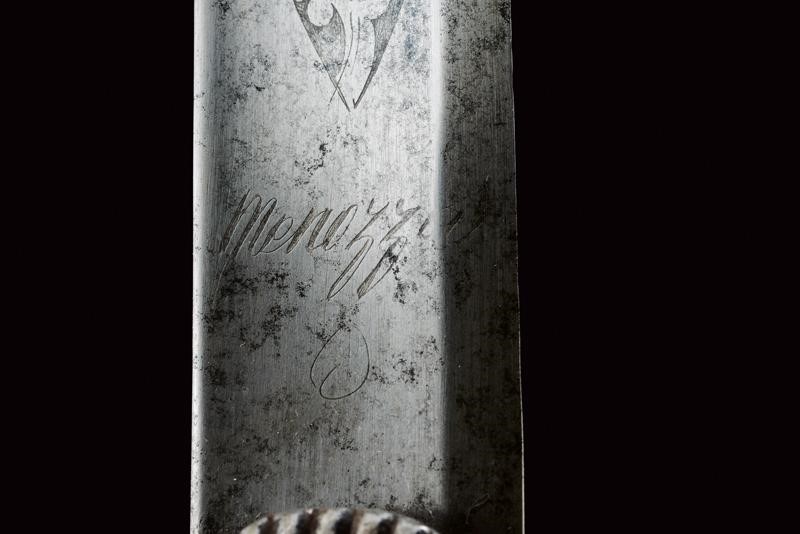 Lama curva a un filo e controfilo con ampio sguscio centrale e scanalatura dorsale; la prima parte incisa a trofei e motivi floreali, la base firmata "Menozza". Fornimento monoelso in ferro con alette fermafodero intagliate a raggi, cappetta lunga. Impugnatura in corno con trecciola metallica. Fodero in ferro con due fascette lavorate en suite con le alette fermafodero, con due anelli di sospensione.