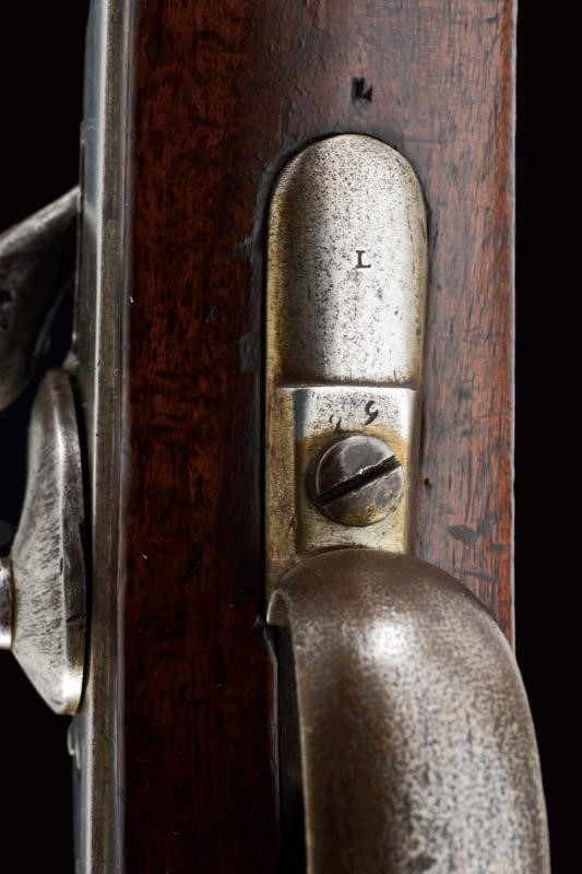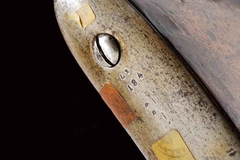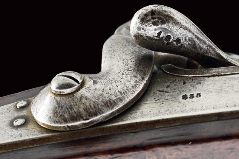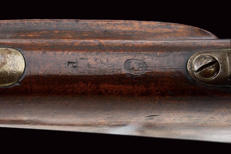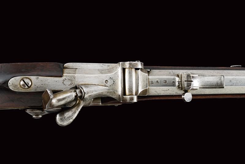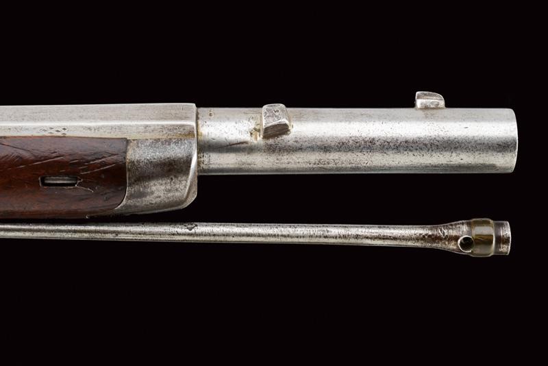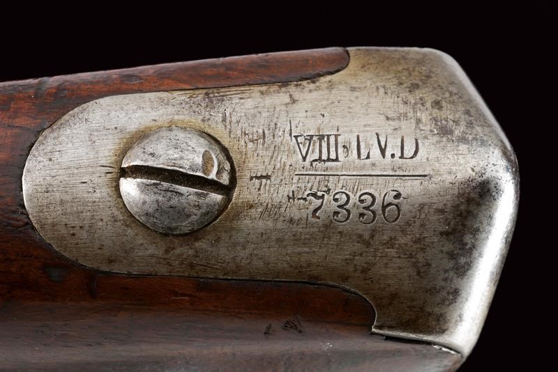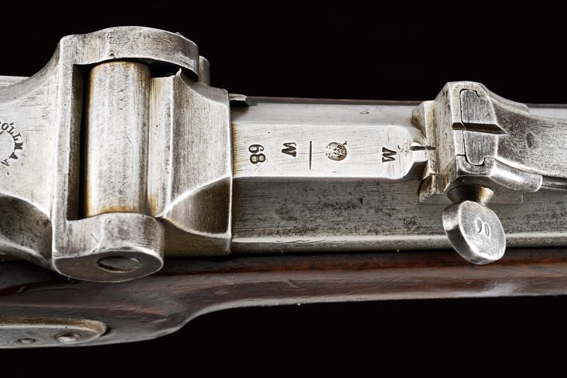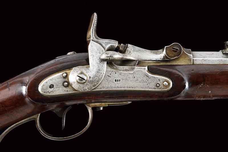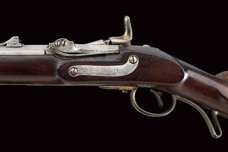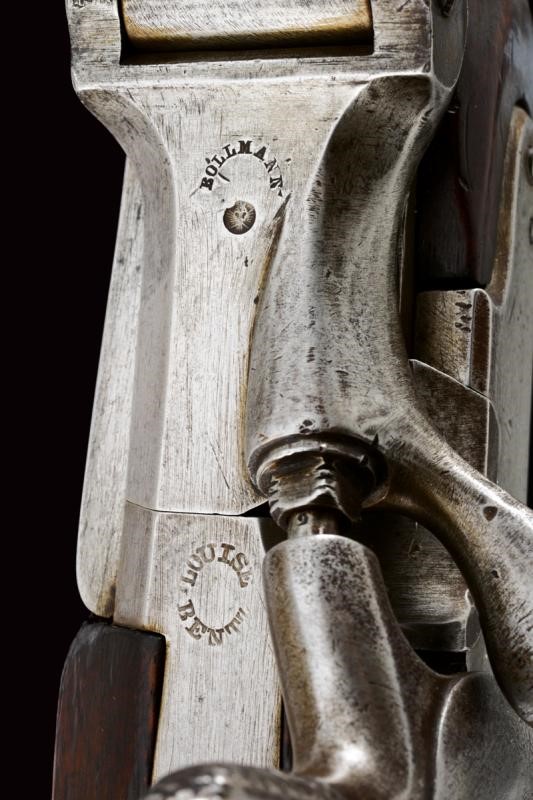 Canna rigata ottagonale, con volata circolare dotata di mirino e dente d'innesto per baionetta, munita di alzo regolabile e con timbri "W" "M" e con l'aquila imperiale, cal. 13,9 mm, (anima pulita, rigatura ben visibile). Otturatore W√§nzel, marcato "BOLLMANN" e con punzone imperiale. Codolo marcato "LOUISE BENTZ". Batteria a molla in avanti, datata "855" e con aquila imperiale, meccanica funzionante. Cassa intera in legno di frutto con qualche segno d'uso e diversi timbri tra i quali "P", "W" e "LB". Fornimenti e bacchetta in ferro. Calciolo marcato "V. III L.V.D. / 7336." Raro modello nato a percussione centrale. Interessante.