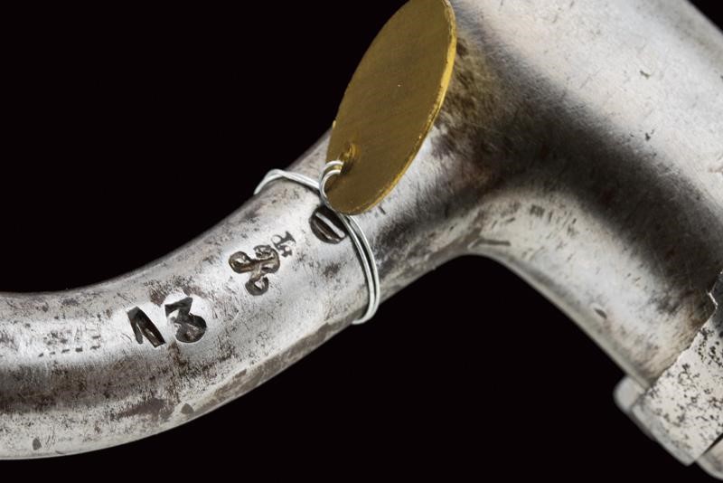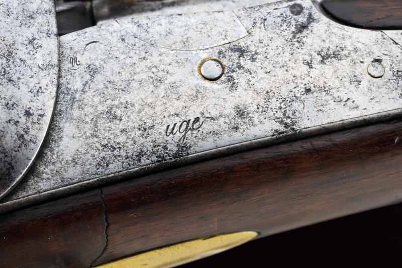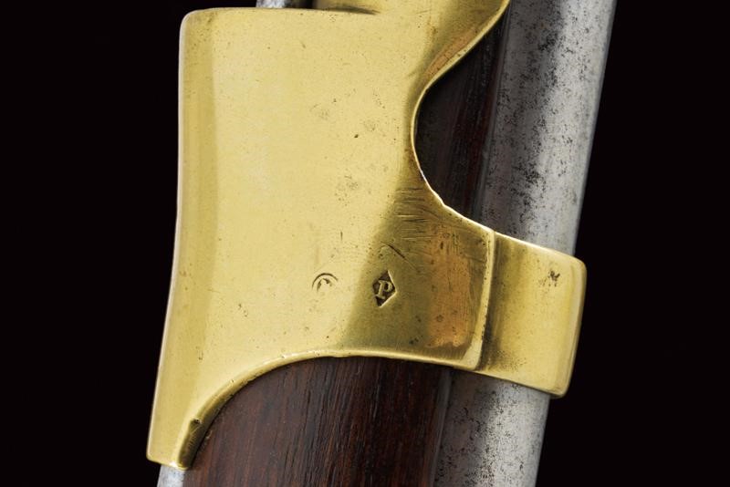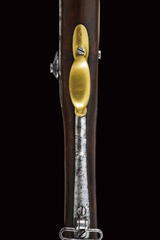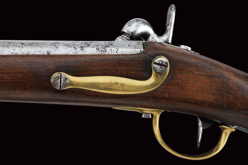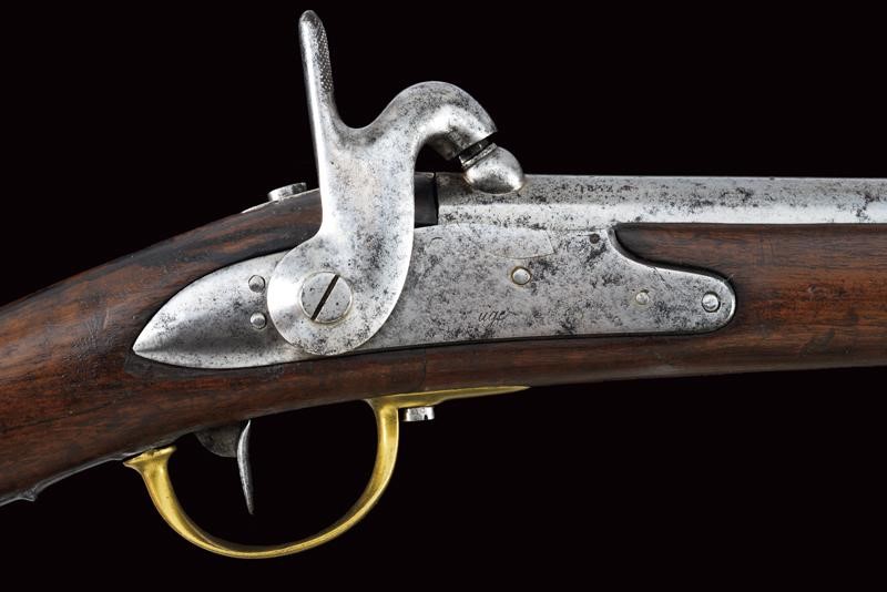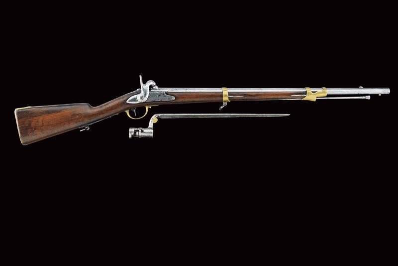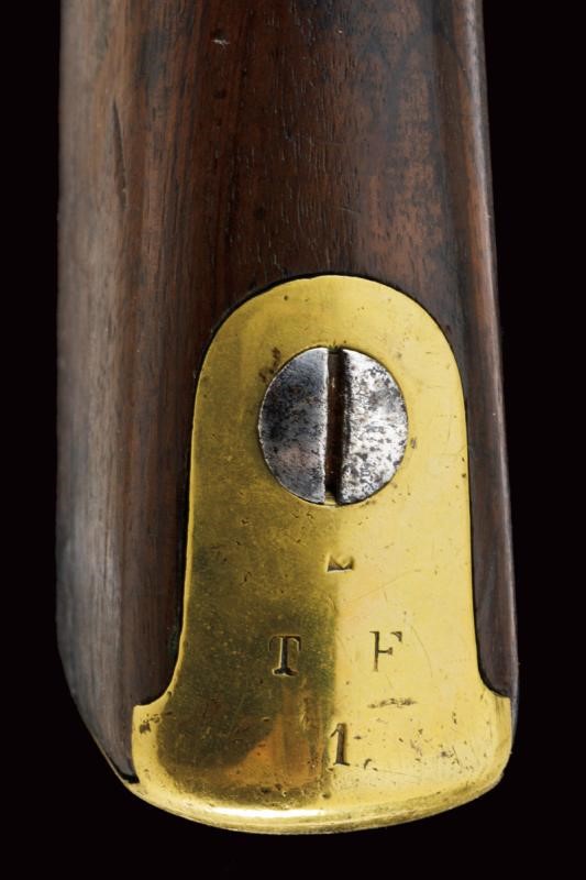 Canna tonda liscia con culatta ottagonale, recante resti di numerazioni alla base, dotata di mirino e dente d'innesto per baionetta, cal. 18 mm. Anima da pulire in volata. Codolo con alzo fisso e dicitura del modello. Batteria ridotta a luminello con tracce di marcatura di Maubeuge. Meccanica ben funzionante. Cassa a tre quarti in legno. Fornimenti in ottone. Calciolo marcato "T F 1" e "2 E" (marchi pontifici?), con tracce di un punzone. Ponticello in ottone e ferro. Bacchetta in ferro. Baionetta a ghiera con piccola crepa al manicotto e marchi al collo (lungh. 47,5 cm)