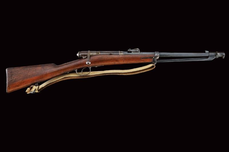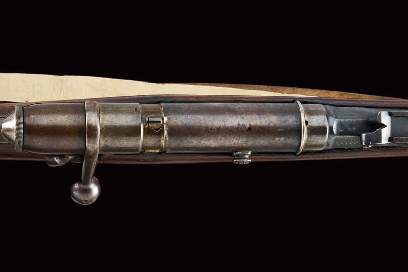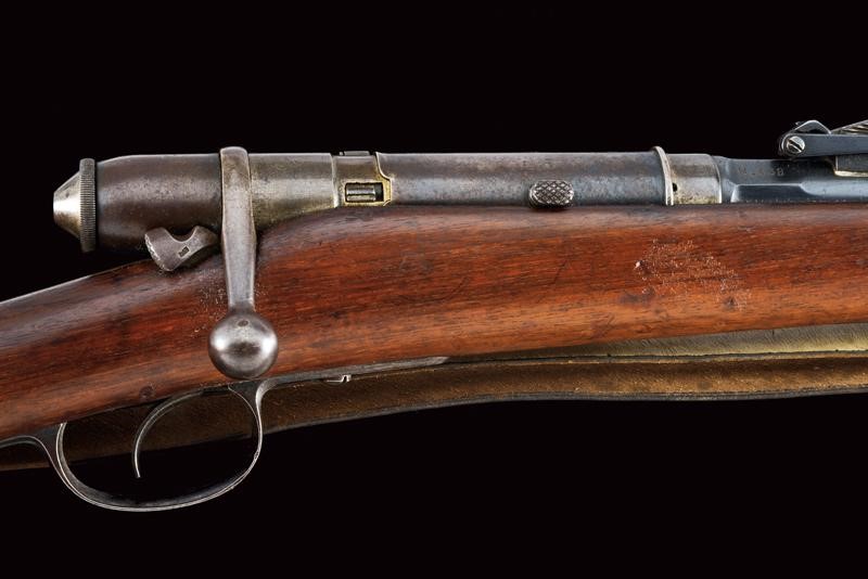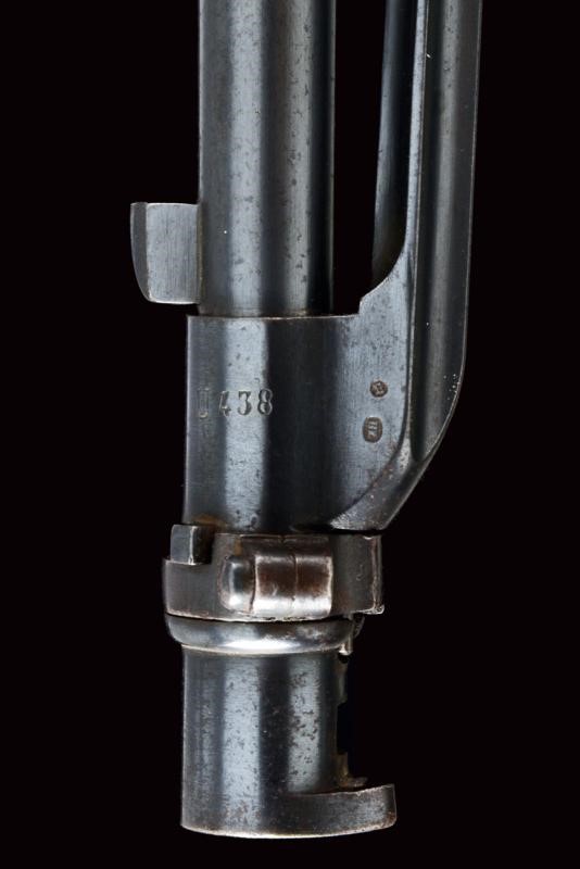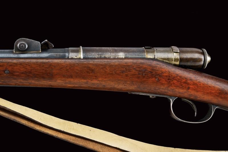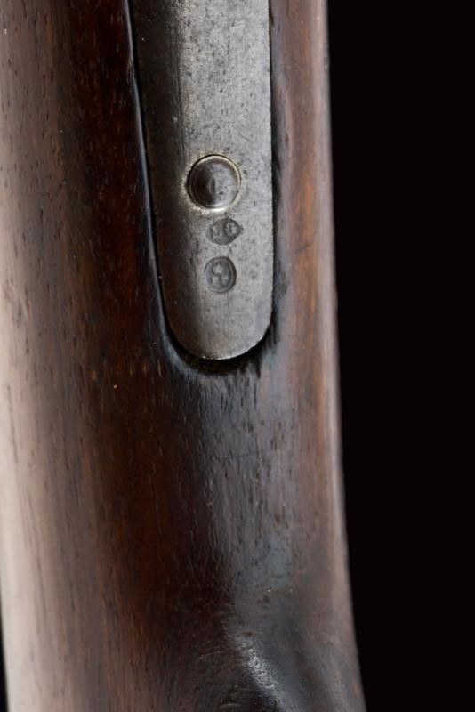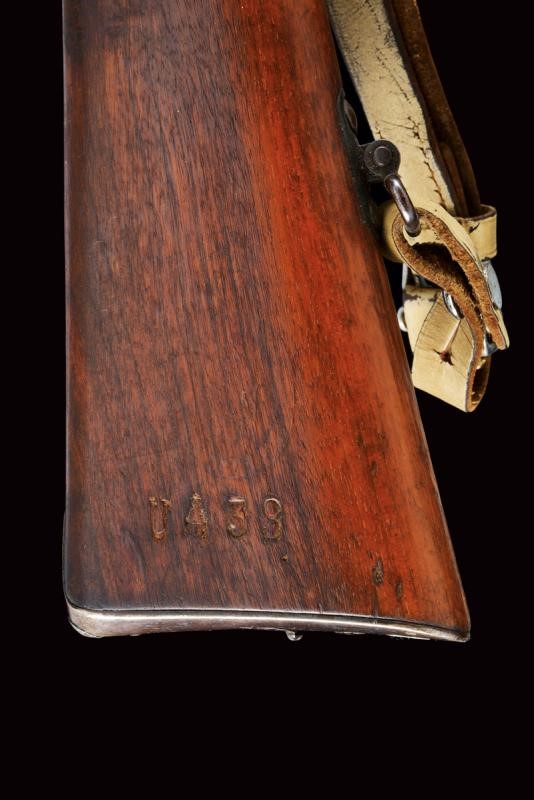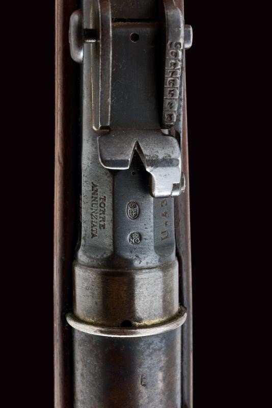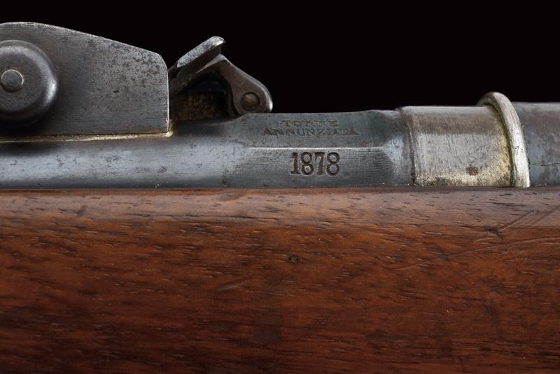 Canna tonda, rigata, marcata "TORRE ANNUNZIATA", "1878", "NC", matricola "U 438" e con punzone piemontese, alzo regolabile e mirino, cal. 10 mm; cassa in legno con matricola coeva, con fornimenti e baionetta (stessa matricola) in ferro. Bacchetta nella coccia.
