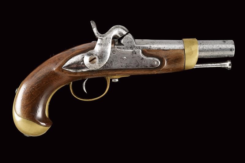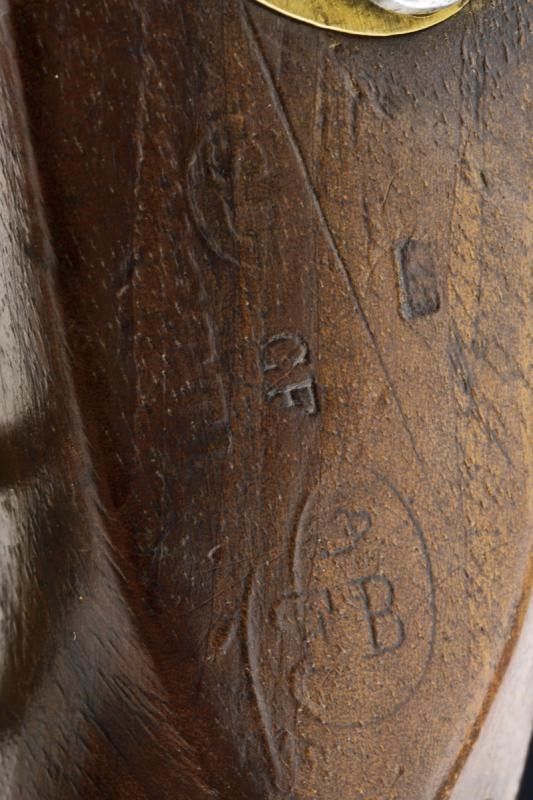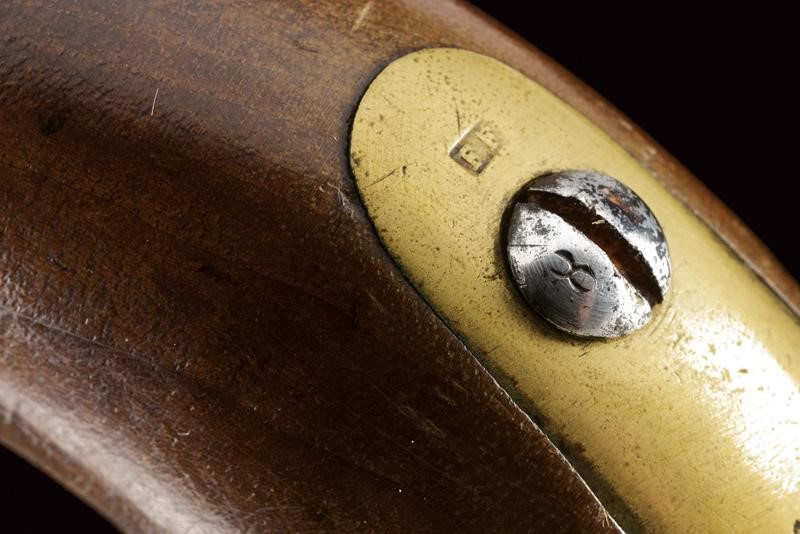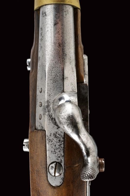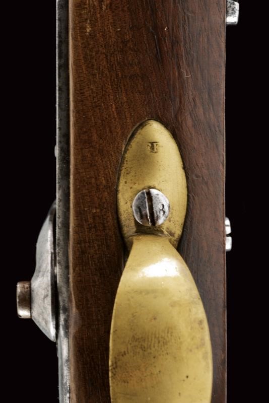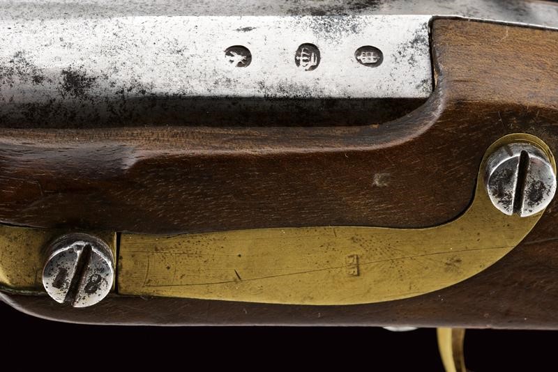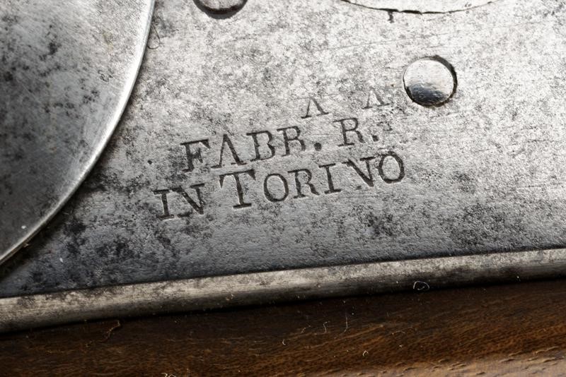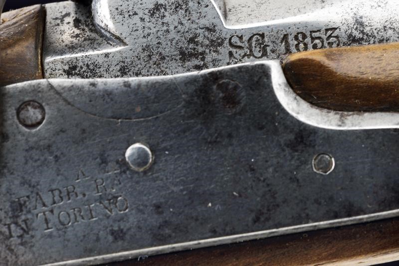 Canna tonda liscia con culatta ottagonale, recante tre punzoni piemontesi e datazione "SG 1853", cal. 15 mm. Batteria a molla in avanti ridotta a luminello, marcata "FABB.A R.A IN TORINO"; cassa in legno con resti di timbri; fornimenti in ottone con punzoni; bacchetta in ferro.