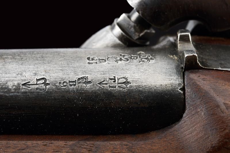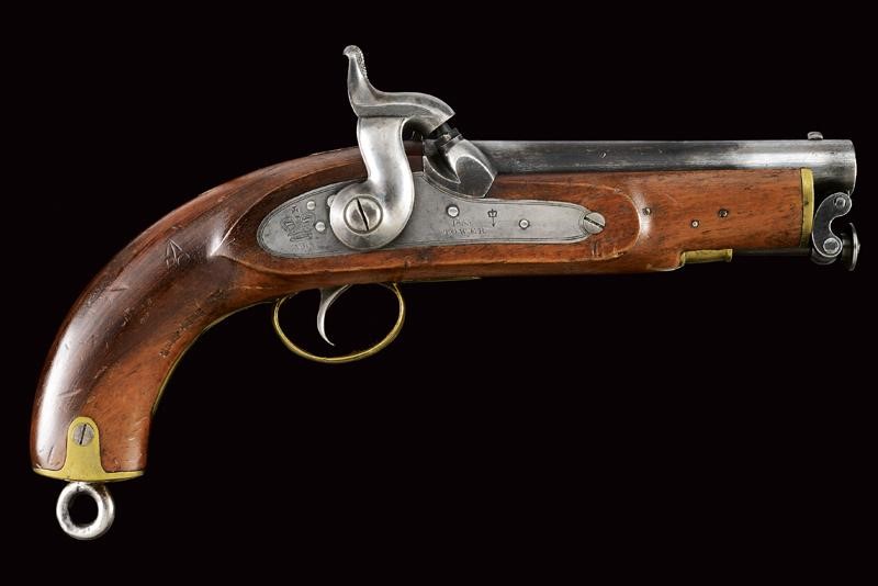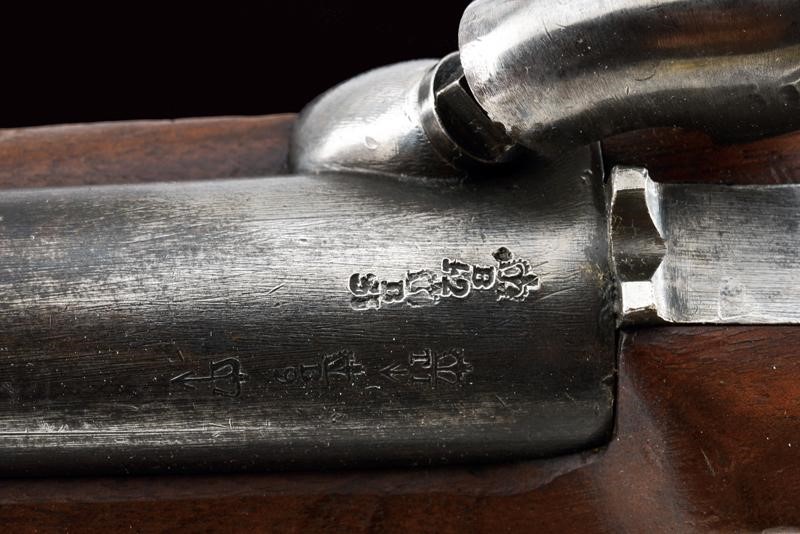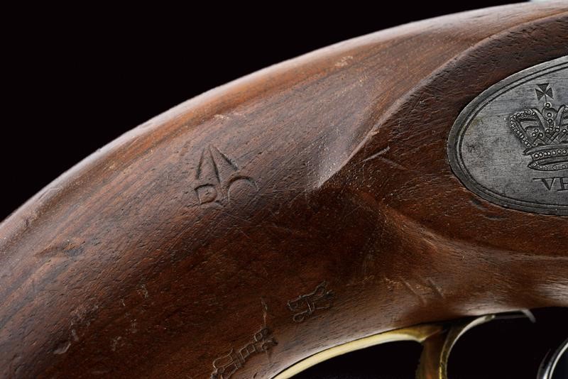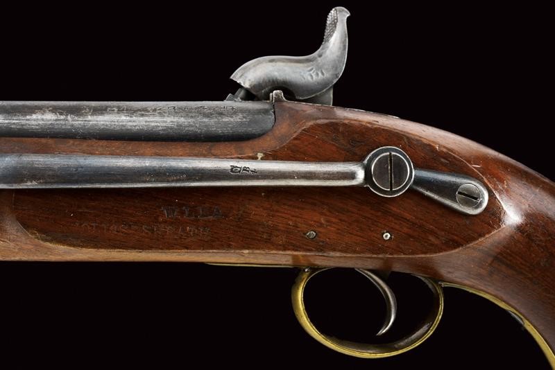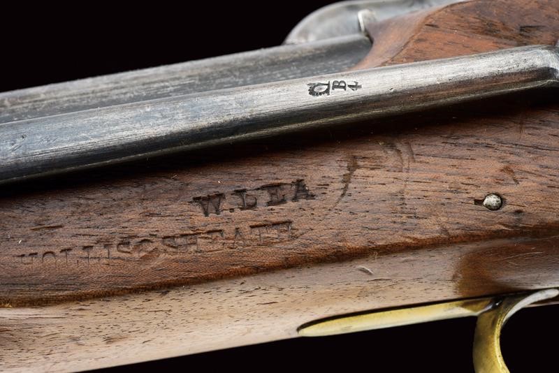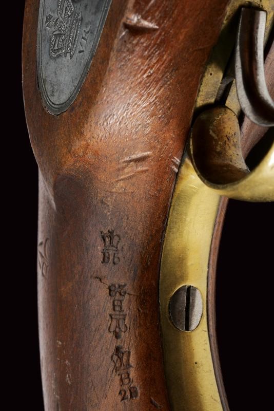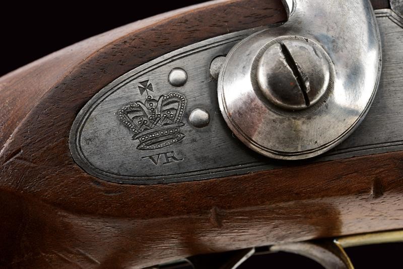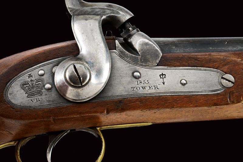 Canna tonda liscia, dotata di mirino, con vari punzoni britannici e la Broad Arrow, cal. 14 mm. Codolo con alzo fisso. Cartella datata "1855", "TOWER", con corona sormontante "V.R." e punzone. Meccanica ben funzionante. Cassa intera in legno marcata "W. LEA HOLLIS & SHEATH" e con vari punzoni. Fornimenti in ottone. Gancio da cintura in ferro punzonato. Tipica bacchetta a snodo in ferro. Anello di sospensione.