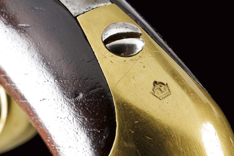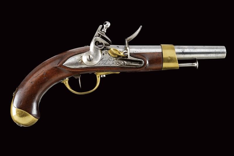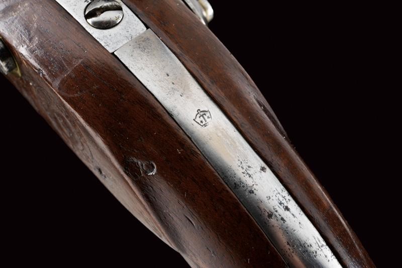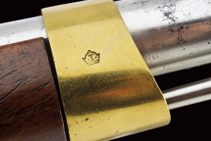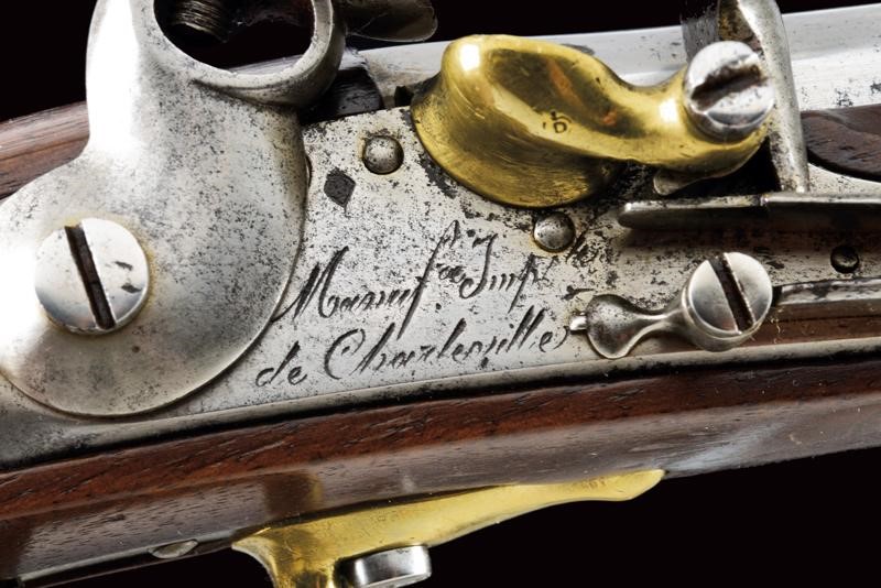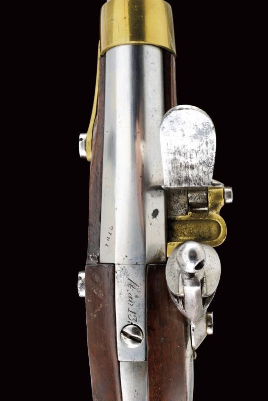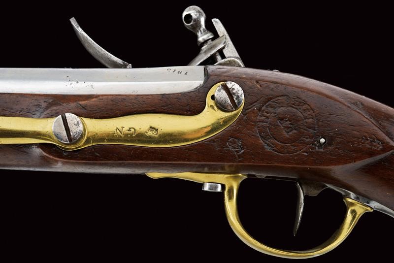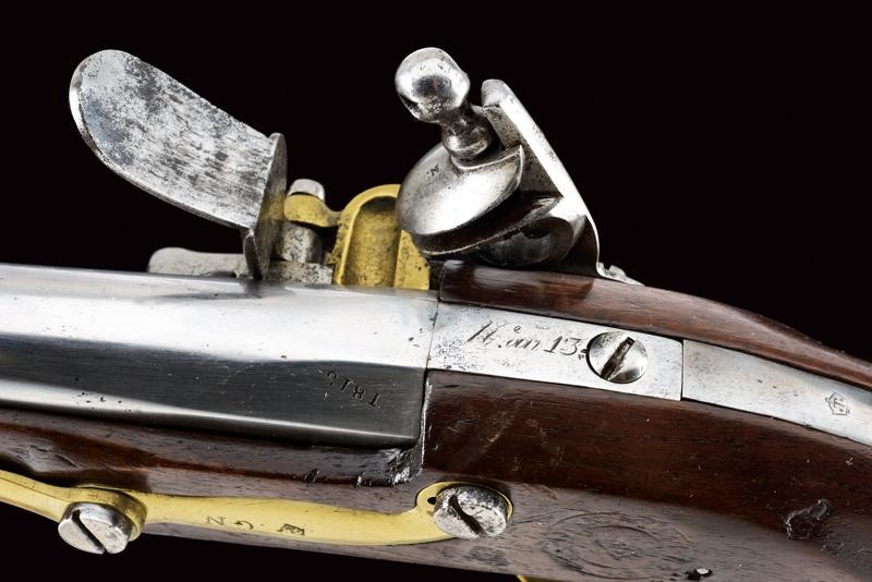 Canna liscia a due ordini, datata alla base "1813", cal. 17.5 mm. Batteria marcata "Manuf. Imp. le de Charleville" e con un punzone poco leggibile, scodellino in ottone; codetta in ferro con punzone "T" tra due stelle entro una corona; cassa in legno con vari punzoni, "P" sotto corona, "GN" ed un timbro del "1813"; fornimenti in ottone tutti punzonati en suite, la contropiastra anche "GN", la bacchetta in ferro.
