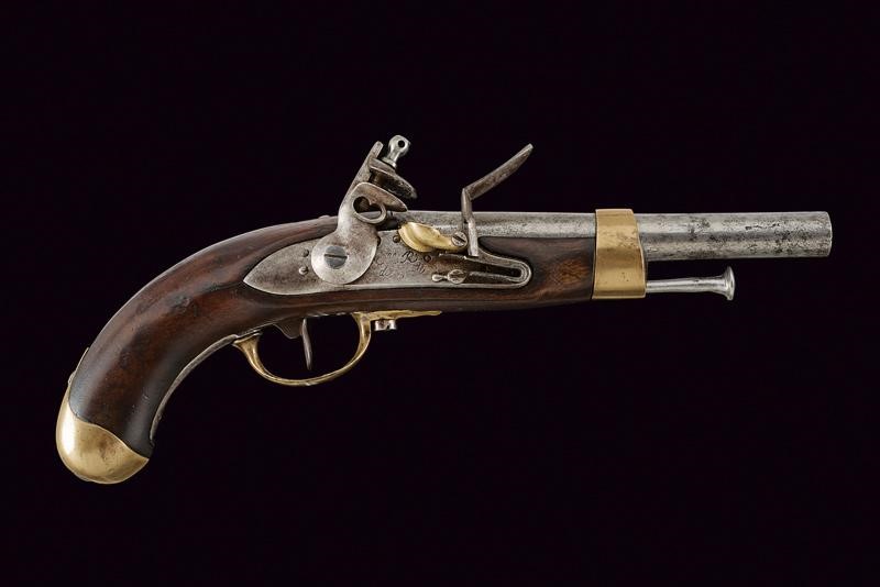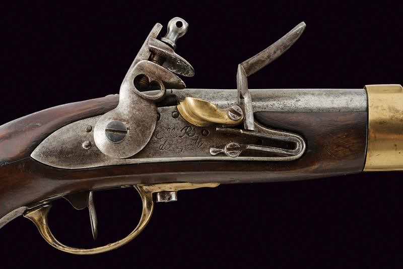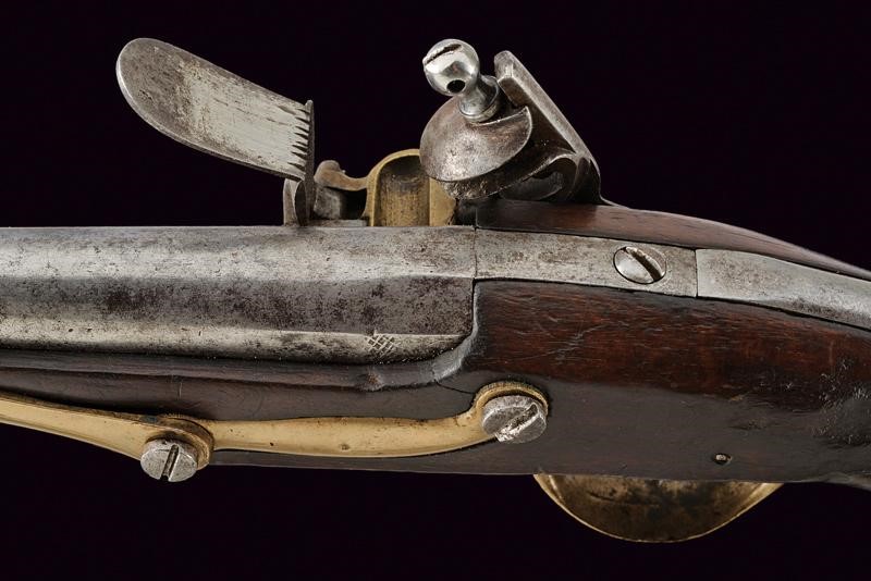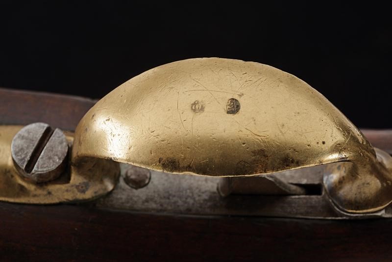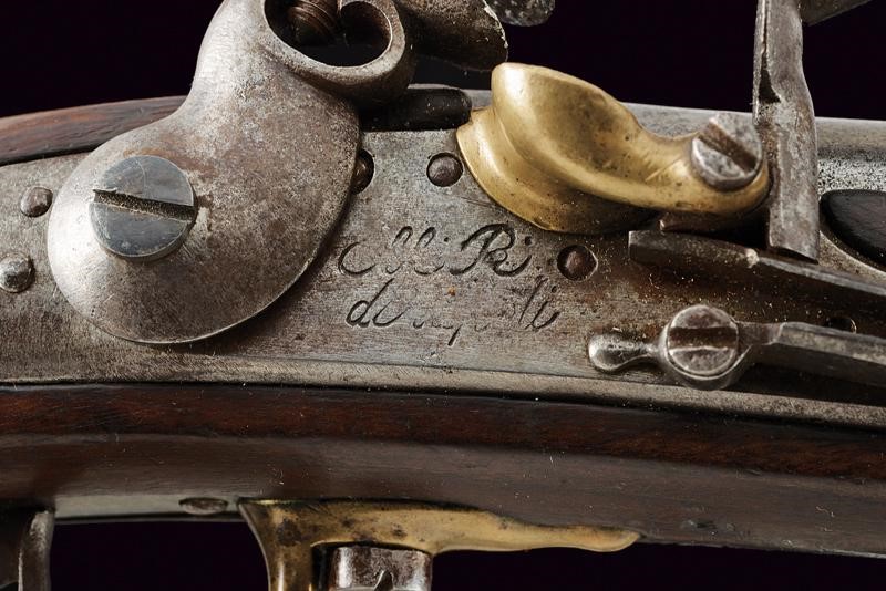 Canna tonda liscia con culatta ottagonale, cal. 18 mm. Qualche intaccatura. Batteria con scodellino in ottone, resti di firma "M.R. di Napoli", recante all'interno la data "1817" e il punzone "A". Vitone del cane forse sostituito. Cassa a tre quarti in legno con qualche segno d'uso e del tempo. Fornimenti in ottone, ponticello, bocchino e contropiastra con resti di punzoni. Bacchetta in ferro. Meccanica funzionante.