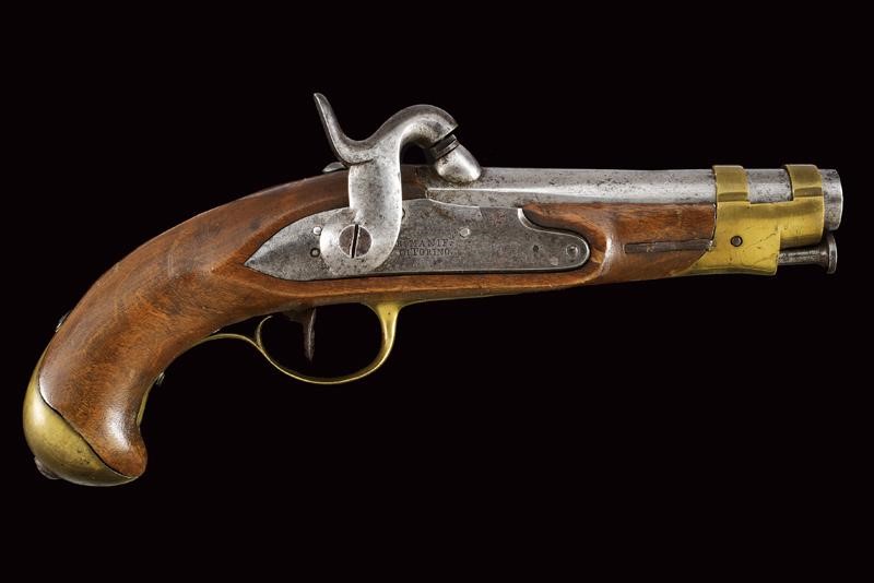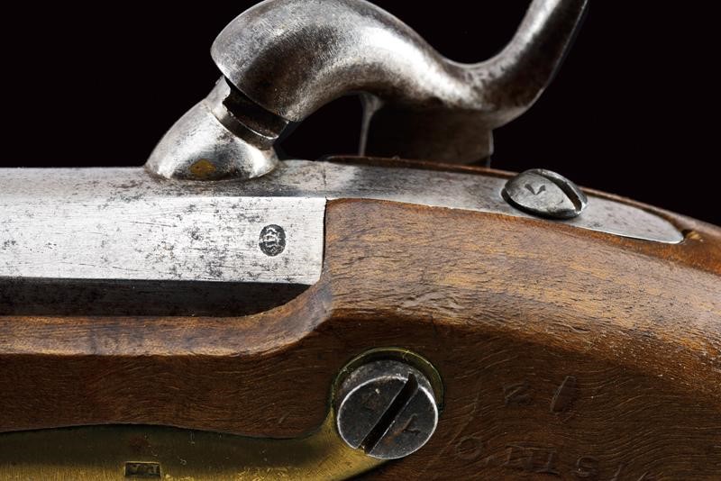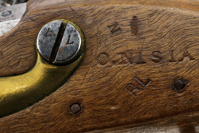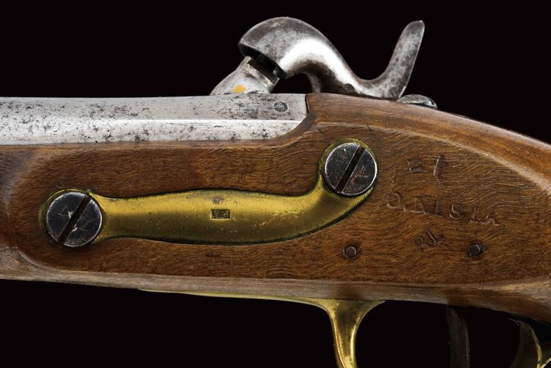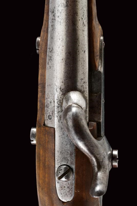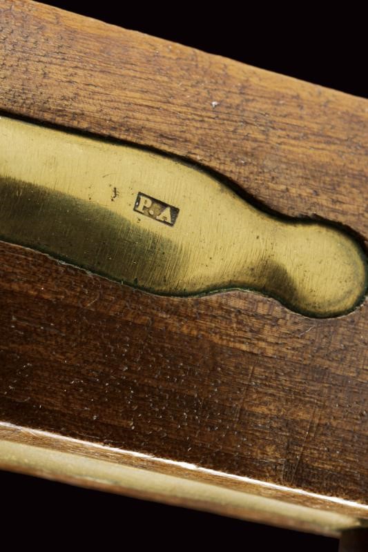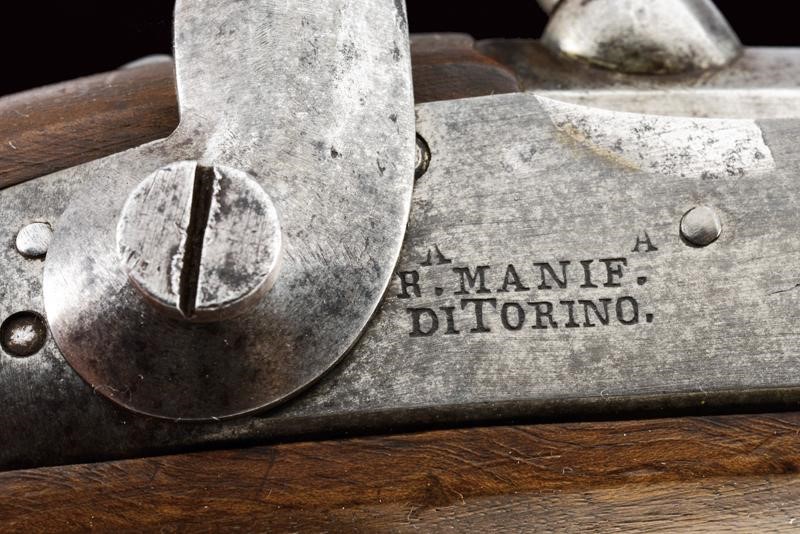 Canna liscia tonda, con culatta ottagonale, recante punzone a corona, cal. 15 mm. Batteria ridotta a luminello con marcatura "R.A. MANIF.A DI TORINO". Meccanica funzionante. Cassa intera in legno marcata "O. NISIA", "BL" e "N". Fornimenti in ottone con punzoni "PA", bacchetta in ferro.