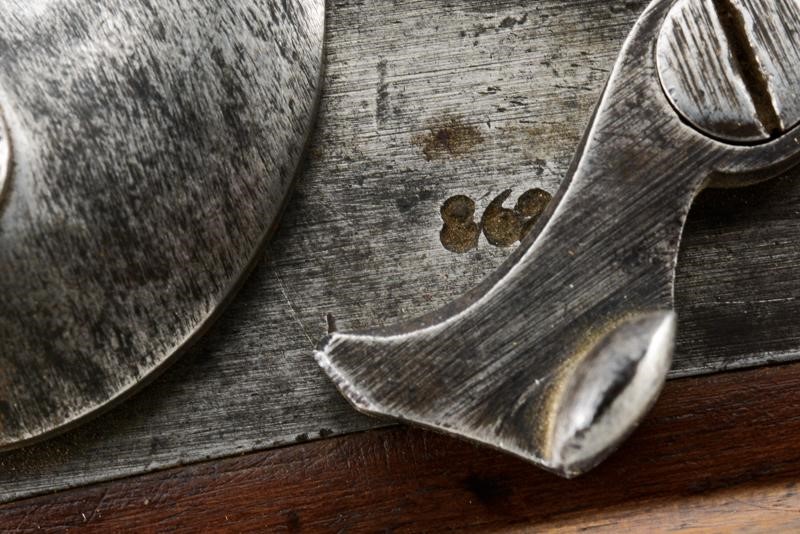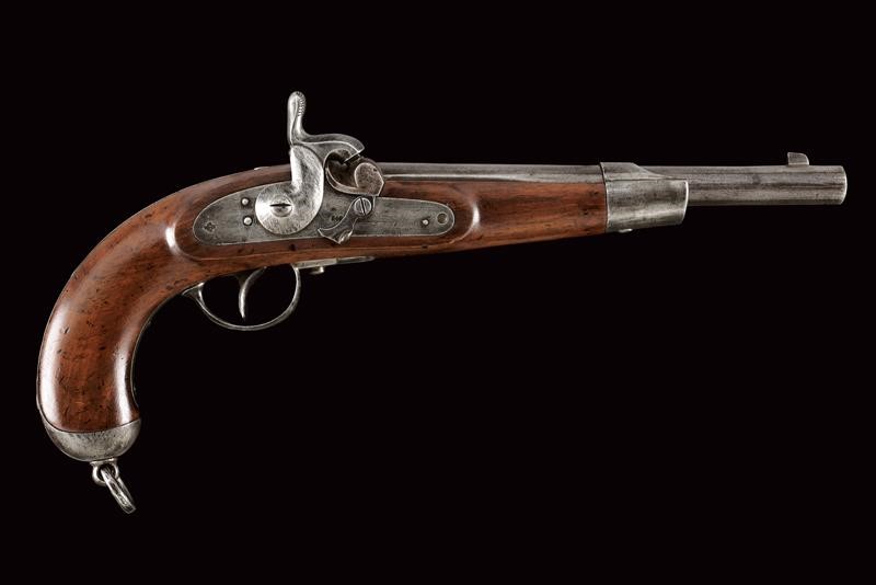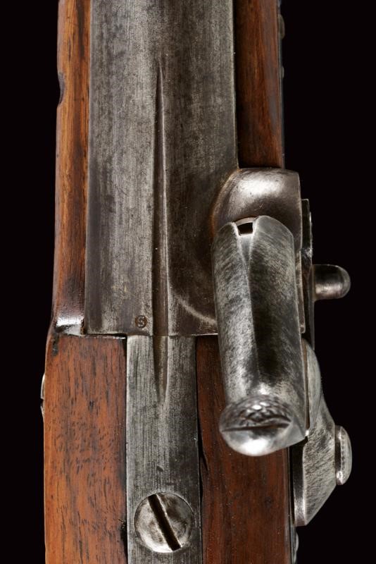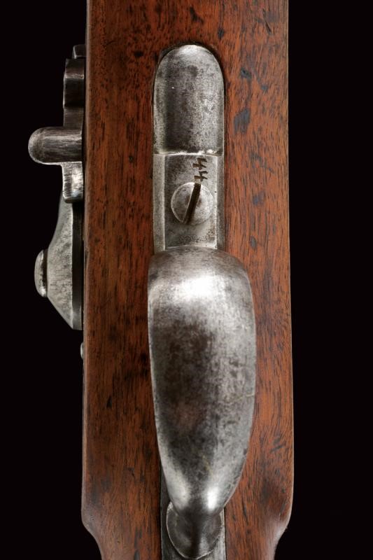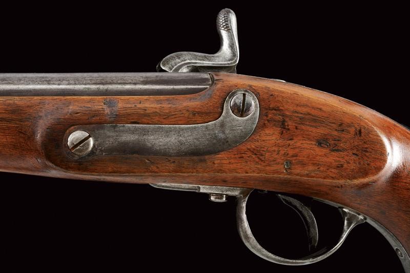 Canna tonda rigata, recante il punzone "S" sulla culatta, dotata di mirino e traguardo a scanalatura, cal. 13,9 mm. Batteria a molla in avanti con sicura, datata "862" e punzonata con aquila bicipite. Meccanica funzionante. Cassa a tre quarti in legno. Fornimenti in ferro. La coccia con anello porta correggiolo.