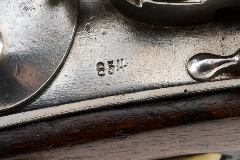 Canna tonda liscia, cal. 17 mm; batteria a molla in avanti con sistema "Augustin", cartella datata "854" e punzonata con aquila bicipite; cassa in legno con fornimenti in ottone e ferro. Raro modello con anello di sospensione in ferro. Vedi "Die Hand- und Faustfeuerwaffen der habsburgischen Heere" di Erich Gabriel, pag. 462/3.