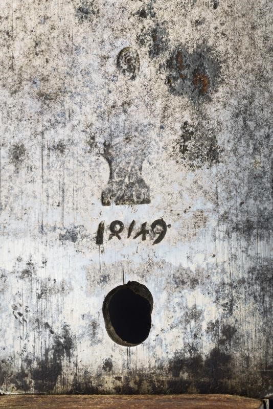 Larga lama con filo a sega e punta circolare, la base forata e dotata del'punzone della Real Fabbrica di Napoli, marchio "S" e anno "1849". Impugnatura a sega in legno. Completa di fodero in cuoio con fornimenti in ottone.