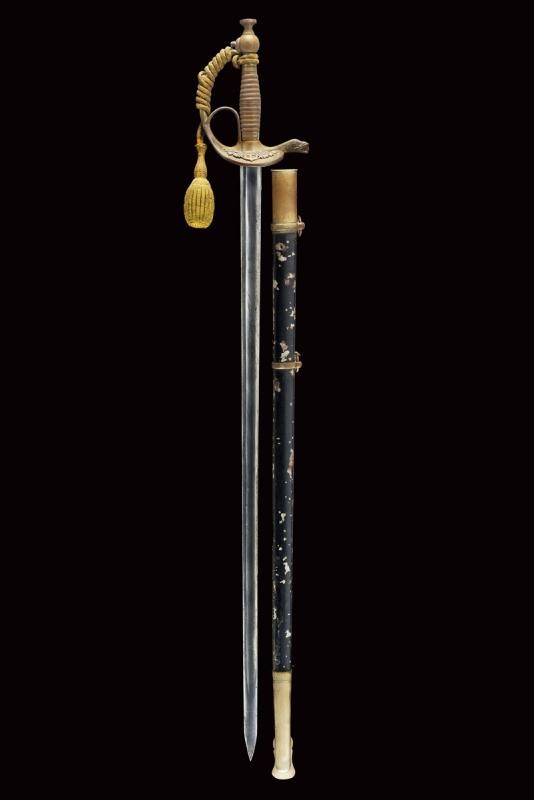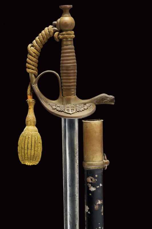 Lama dritta a un filo e controfilo, sgusciata. Fornimento in ottone, elso di tipica forma con valva anteriore recante emblema sabaudo coronato in rilievo e in metallo bianco. Il braccio di parata a serpente. Guardia con tipico anello di presa. Impugnatura in lamina metallica. Fodero in ferro con resti di tintura nera (qualche danno e mancanza) e fornimenti in ottone a due campanelle. Le parti in ottone con tracce di argentatura. Dragona in canottiglia dorata con piccoli danni e mancanze, segni d'uso e del tempo. Cfr: vedi Calamandrei "Storia dell'Arma Bianca Italiana", ed. Olimpia 1999, pag. 48-49.