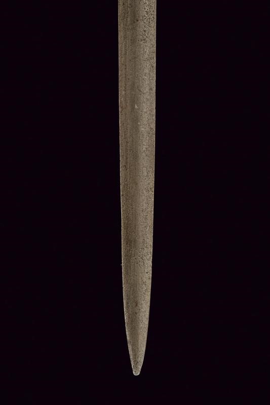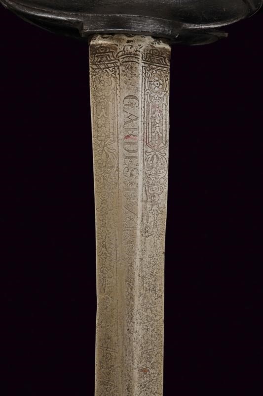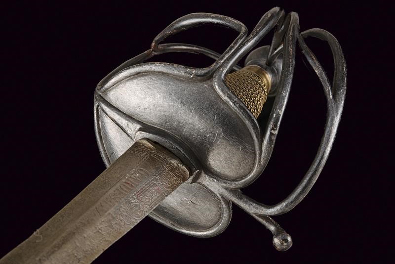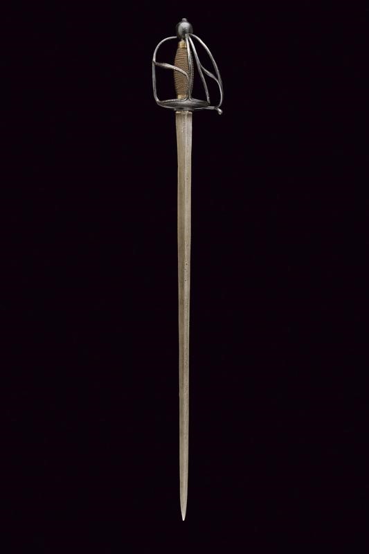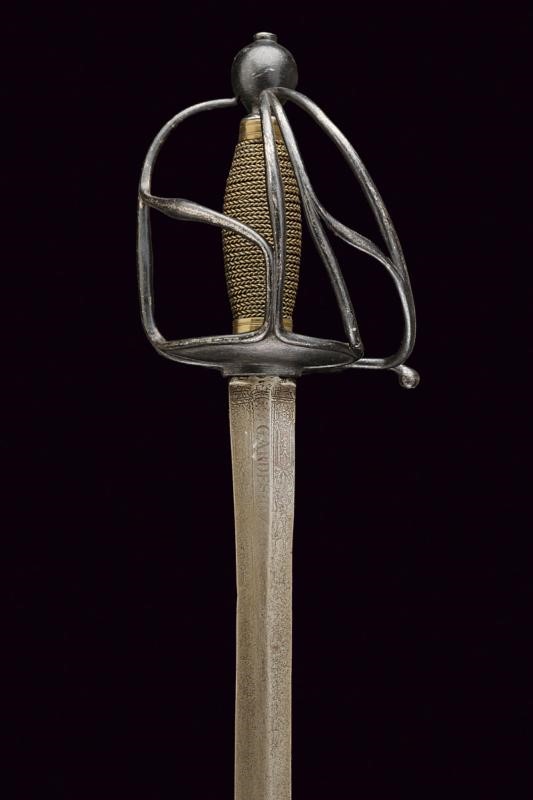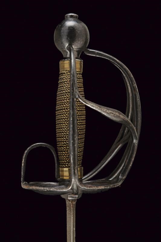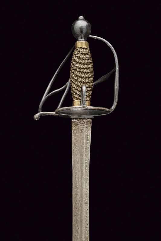 Lama dritta a due fili di sezione lenticolare, di sezione esagonale nella prima parte, incisa su un lato con iscrizione "GARDES DU ROY" e, sull'altro lato "MANUFACTURE ROY", entrambe le marcature fra decorazioni floreali. Fornimento in ferro annerito, doppia valva liscia a formare un cuore, i rami di guardia leggermente ingrossati al centro. Pomo sferico. Anello da pollice. Impugnatura in legno rivestita con trecciola in filo d'ottone tra ghiere lavorate ad anellature. Provenienza: Collezione R. Brooker, n. inventario S - 490.