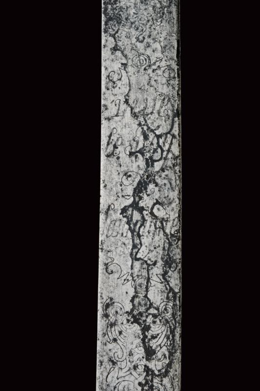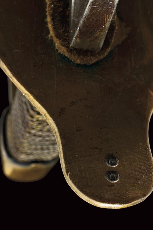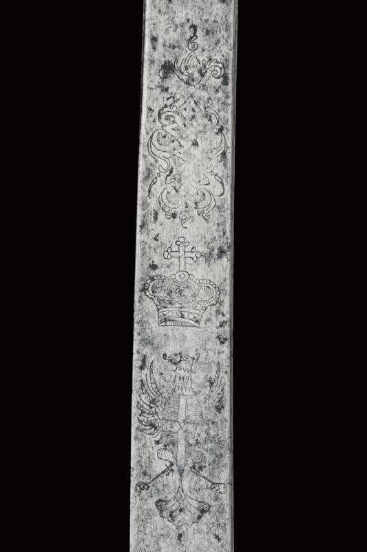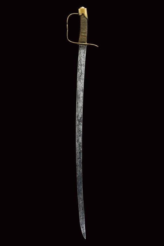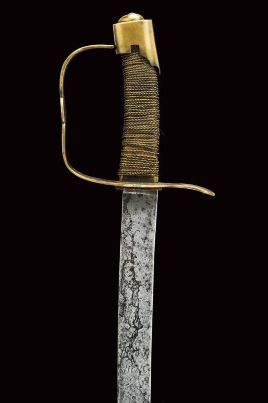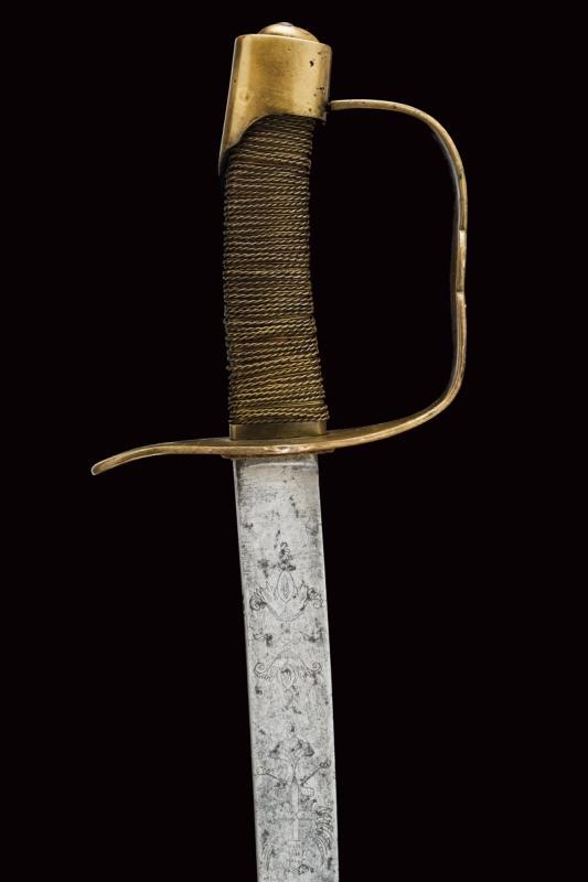 Lama leggermente curva piatta, a un filo, incisa alla base con motto "Vive le Roy De Sardaigne" fra decorazioni su un lato e, sull'altro, con aquila Sabauda decorata en suite. Zone con danni da ruggine. Fornimento francese in bronzo a un ramo di guardia, cappetta corta liscia ed impugnatura in legno rivestita di trecciola metallica di restauro. Rara.
