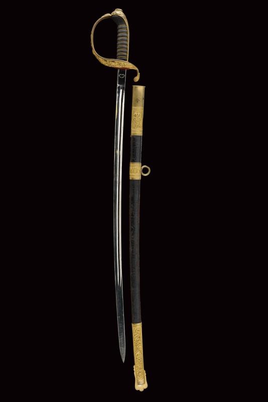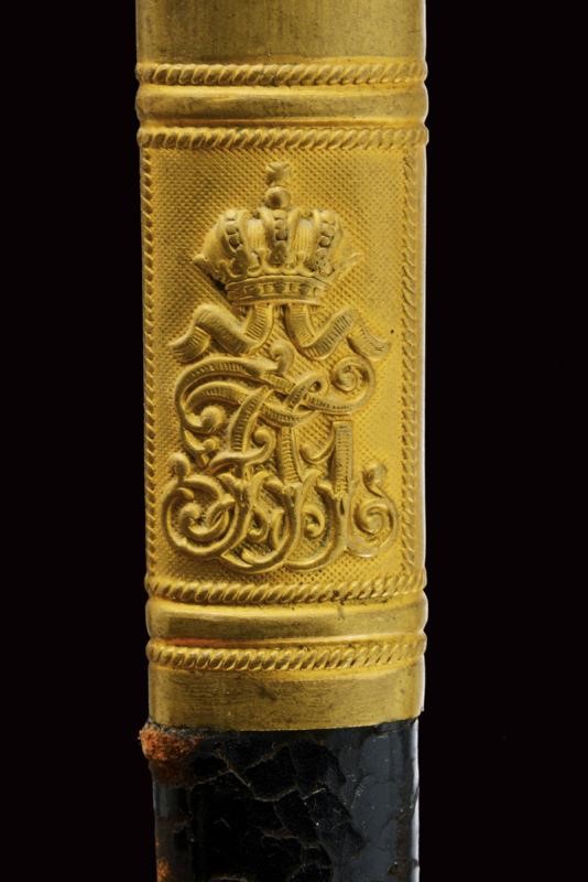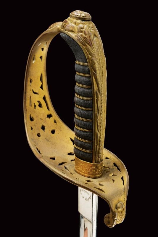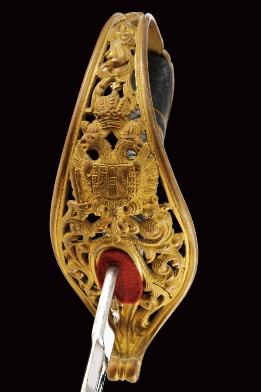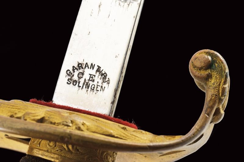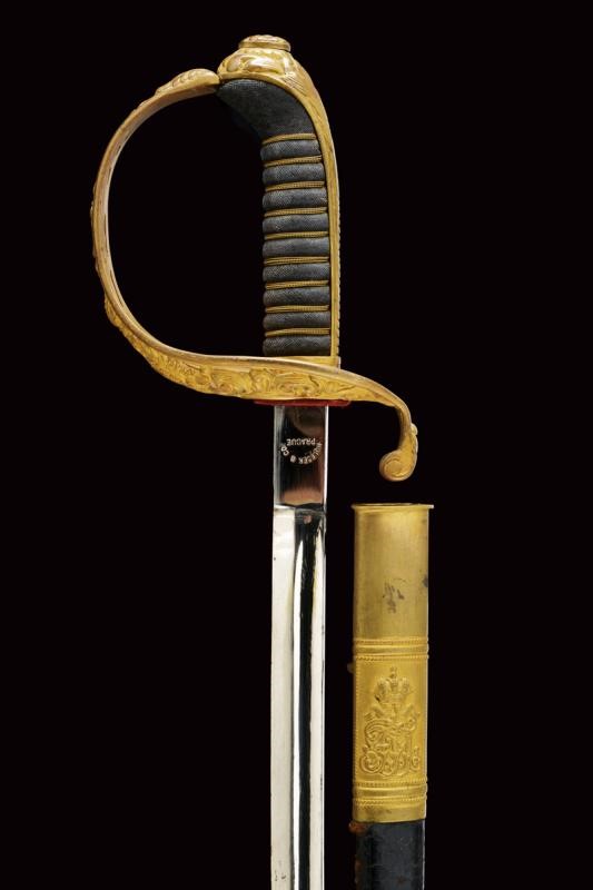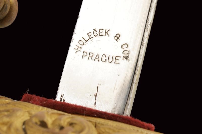 Lama nichelata marcata "HOLLECK & CO PRAGUE" su un lato e, sull'altro, "GARANTIERT C.E. SOLINGEN". Fornimento in ottone dorato con coccia riccamente traforata e con aquila imperiale; impugnatura in legno rivestita di pelle di pesce con trecciola. Completa di fodero con fornimenti in ottone, la cappa con monogramma "FJ1" coronato. Una campanella e un passante.