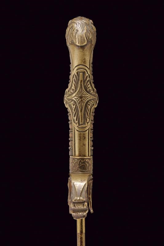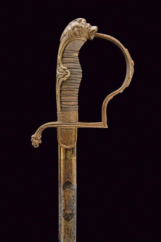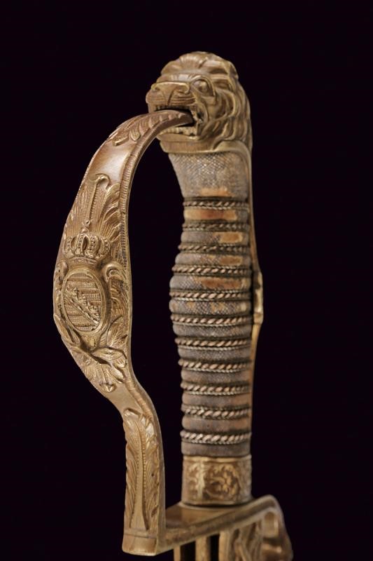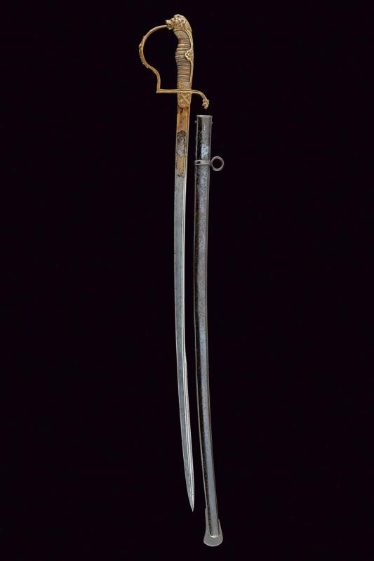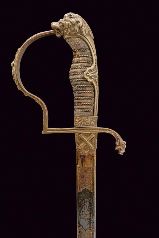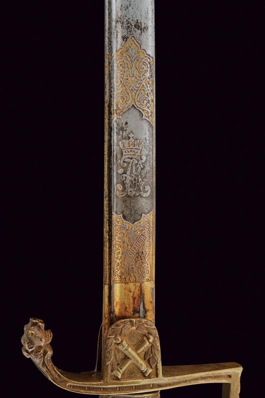 Lama leggermente curva con jelman, incisa e dorata nella prima parte, con monogramma reale "AR" sotto corona (per re Alberto 1873 - 1902) fra arabesche e "EISENHAUER" su un lato, sull'altro lo stemma reale sotto corona con il motto "Providentiae Memor". Fornimento in ottone con alette fermafodero, decorato sul lato anteriore con cannoni incrociati. Braccio di parata a testa di leone, ramo di guardia con emblema reale sotto corona, pomo a testa di leone. Impugnatura in legno rivestita con pelle di pesce e trecciola metallica (piccole mancanze). Completa di fodero in ferro con gran parte della brunitura originale. Un anello di sospensione e un passante.