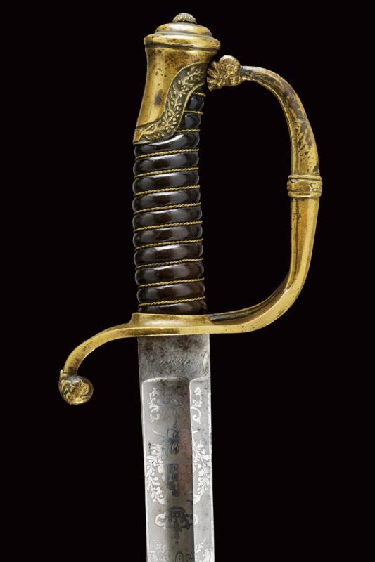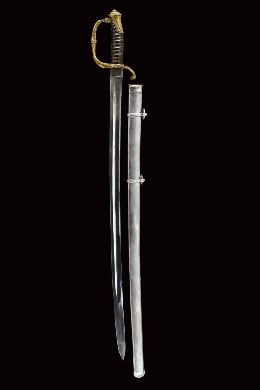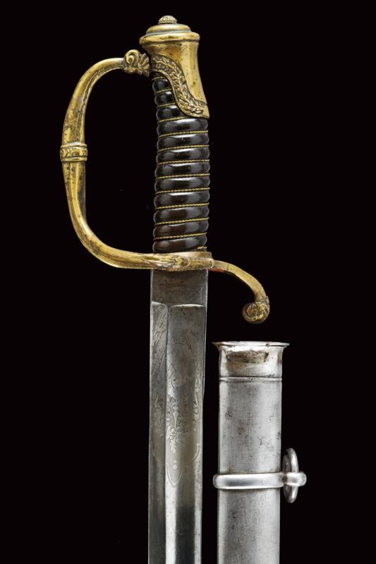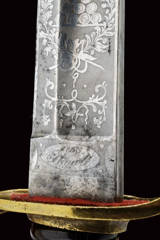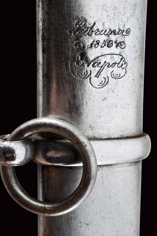 Lama leggermente incurvata a un filo, punta e breve controfilo, sgusciata, costolata in mezzeria al debole; incisa alla base sul lato di terza con un trofeo e con firma "Labruna" al tallone, su quello di quarta con palle di cannone sormontate da corona entro un serto di lauro e quercia, al tallone "1853 Napoli". Fornimento in ottone con segni d'uso e del tempo, guardia munita di un ramo aggiuntivo, decorato a foglie in rilievo, cappetta con fronde di lauro. Impugnatura in corno con spirale di trecciola in ottone. Fodero in ferro (segni d'uso e del tempo, forse una riparazione all'imboccatura) con firma e data "Labruna 1853 Napoli".