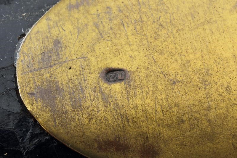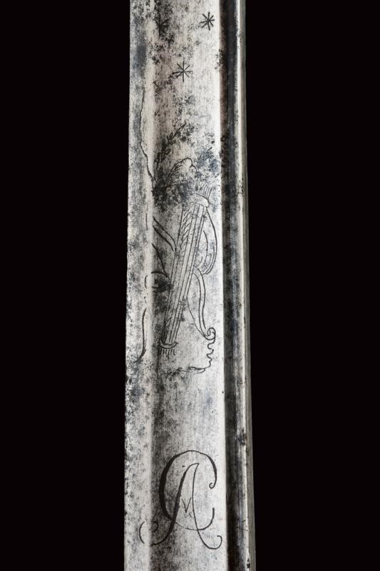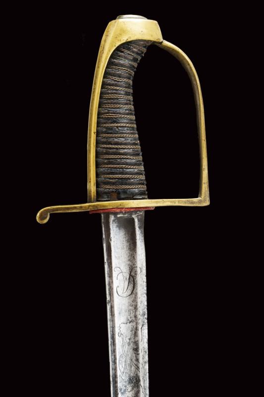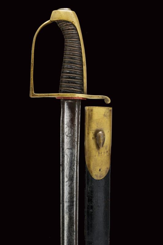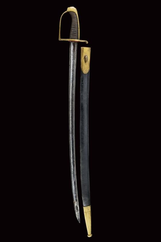 Lama curva a un filo e breve controfilo, sgusciata e scanalata, incisa al forte su entrambe le facce con un trofeo di faretra, arco e frecce, recante il monogramma "CA" (per Carlo Alberto) senza corona. Segni d'uso e del tempo. Fornimento in ottone con resti di doratura. Guardia a staffa, cappetta lunga. Impugnatura con rivestimento in pelle antica e trecciola in rame. Fodero in cuoio antico con fornimenti in ottone, cappa punzonata "ZL".