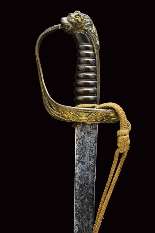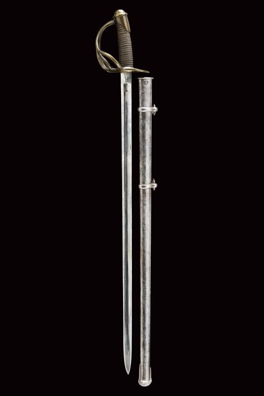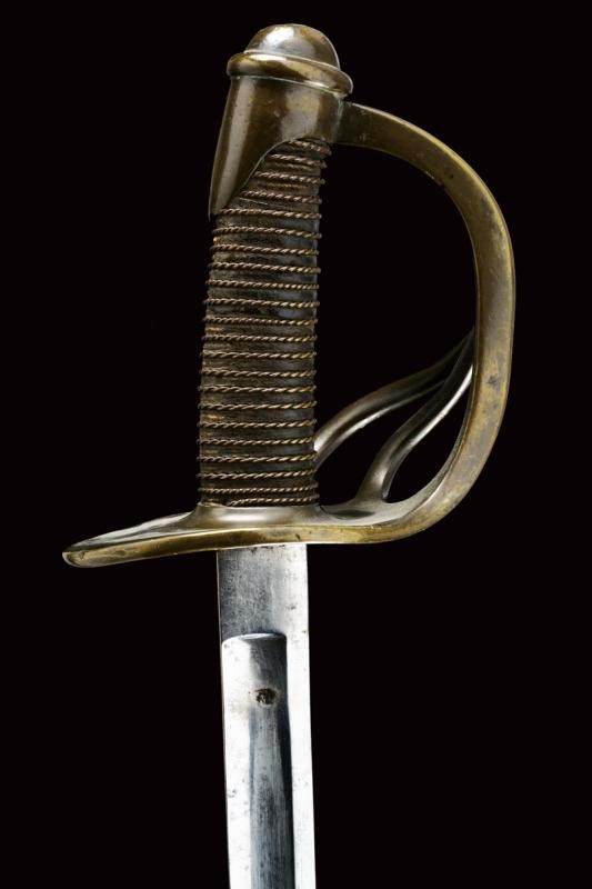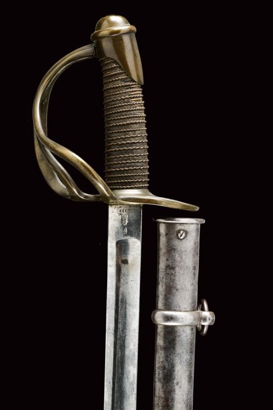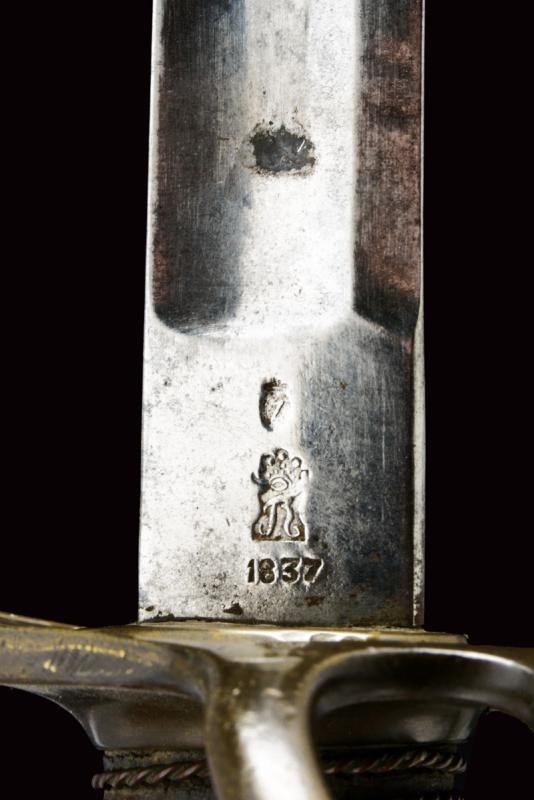 Lama dritta a un filo e controfilo con ampio sguscio centrale e sottile scanalatura dorsale, il tallone con punzone della Real Fabrica di Napoli, punzone "Z" sotto corona e anno di produzione "1837". Il fornimento in bronzo marcato "5.S.49" e "1". Impugnatura in legno rivestita di cuoio, con trecciola metallica. Completa di fodero a due anelli di sospensione.