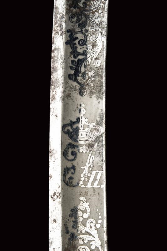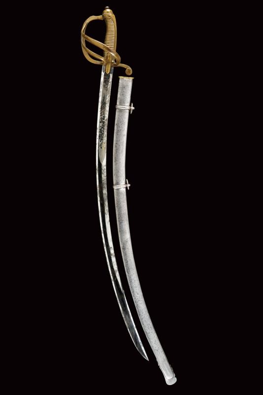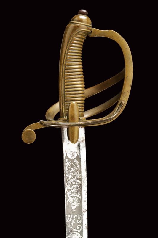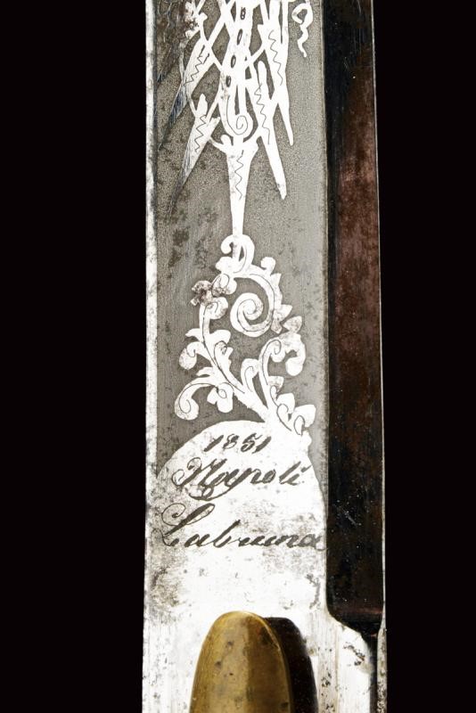 Lama curva a un filo e controfilo, ampiamente sgusciata, recante al forte belle incisioni a motivi floreali e trofei, sul lato di terza al tallone la marcatura "1851 Napoli Labruna", sul lato di quarta "FII" coronato (re Ferdinando II). Fornimento in ottone a tre rami di guardia, con alette fermafodero ellittiche e convesse. Impugnatura in un unico pezzo in ottone con resti di doratura, bottone in ferro faccettato. Fodero in ferro a due anelli di sospensione con cappa in ottone.