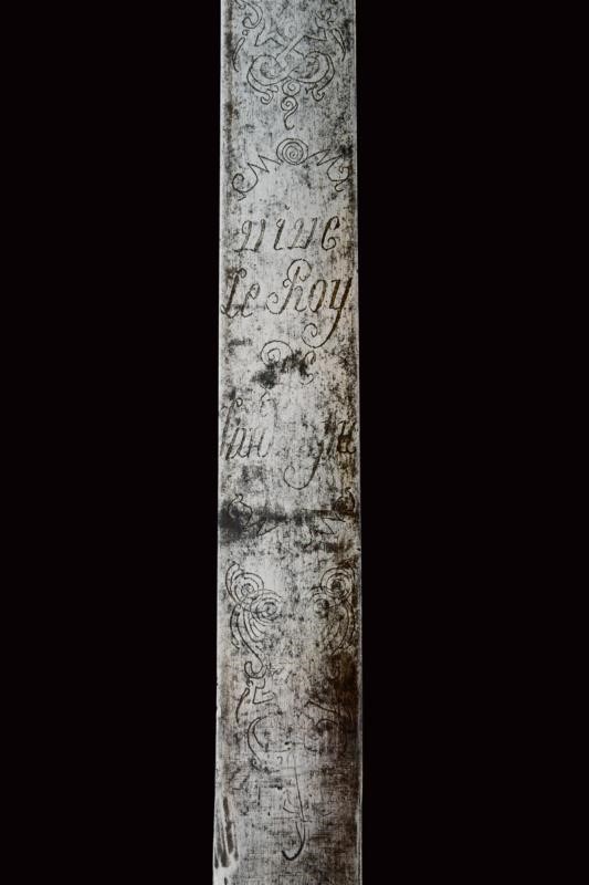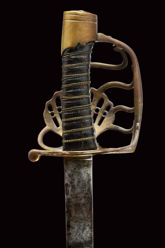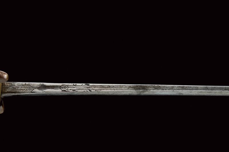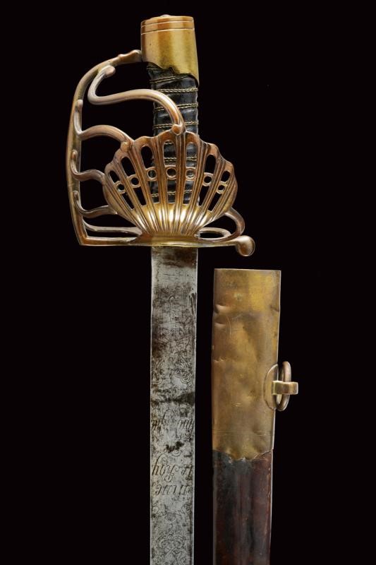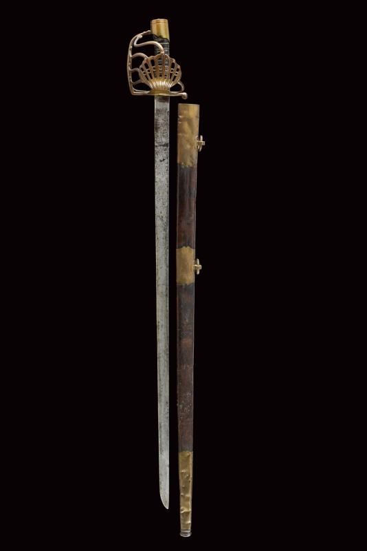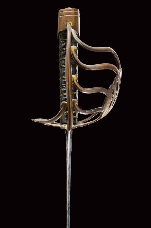 Lama dritta a un filo e controfilo, piatta, con base incisa con il motto "vive le Roy de Sardaigne" tra decorazioni su un lato e con aquila sabauda sotto corona sul lato opposto. Fornimento a gabbia, con valva a conchiglia traforata raccordata con quattro rami controcurvati alla guardia. Cappellotto liscio e a testa piana, decorato con un rombo. Impugnatura in legno rivestita di cuoio e con trecciola metallica. Fodero in cuoio marrone con fornimenti in ottone (intaccature). Due anelli di sospensione.