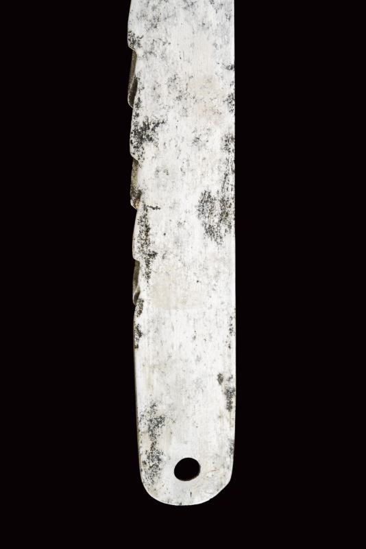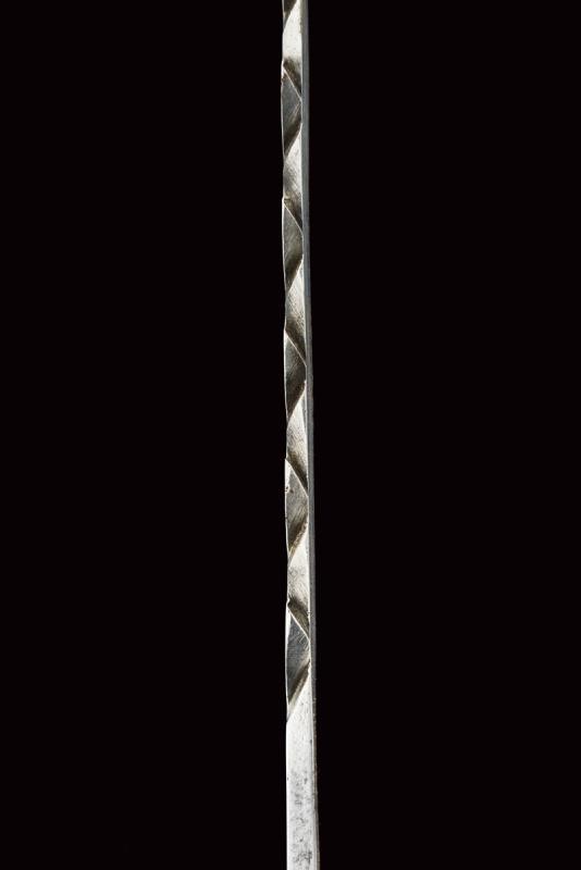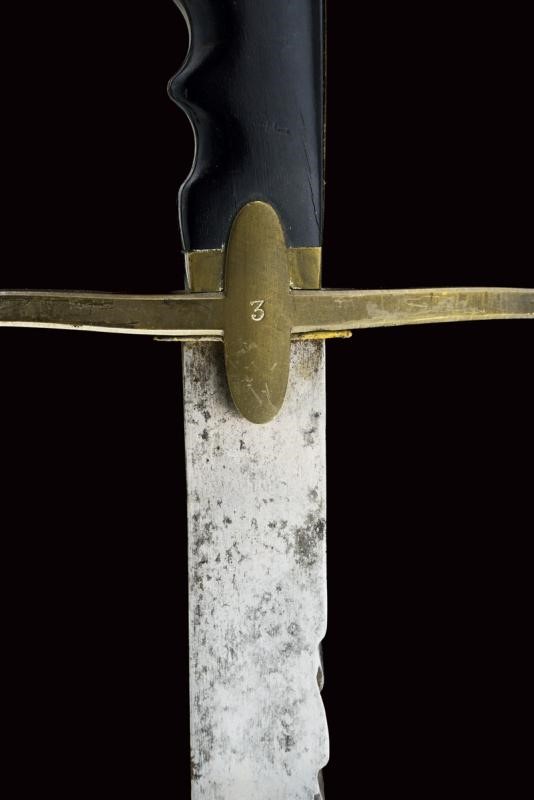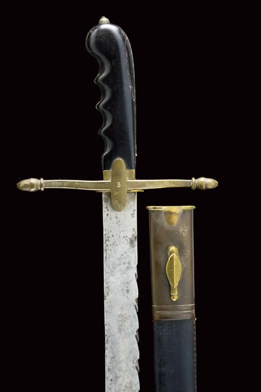 Larga lama dritta a un filo con dorso a sega con punta tonda traforata; fornimento in ottone con elso a croce marcato "3", alette fermafodero ovali e cappetta liscia lunga; impugnatura in ebano di forma anatomica; fodero in cuoio con fornimenti in ottone. Rara. Vedi "Armi Bianche Militari Italiane 1814-1950" di Cesare Calamandrei, pagina 48/49 con ill.